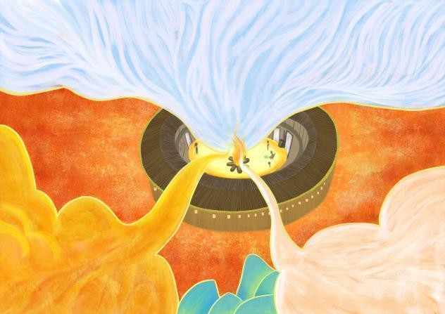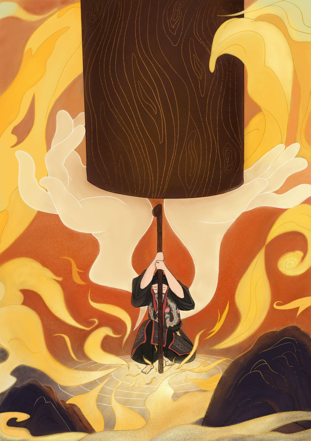 《布洛陀顶天》 黄丽金 板绘a42023年 《莫一大王飞天》 黄丽金 板绘a42023年