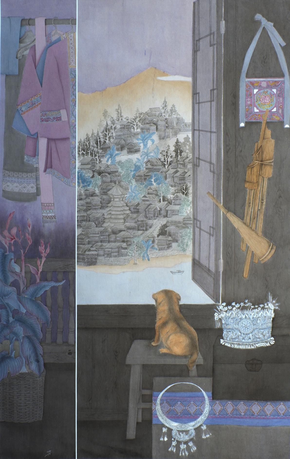 《侗乡别韵》石应开 纸本设色 120cmX180cm 2023年