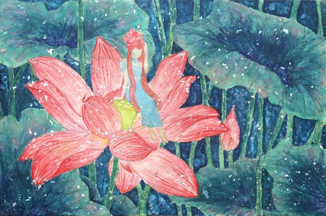 《花觅》之荷花 柯钿钿岩彩 40cmX60cm 2023年