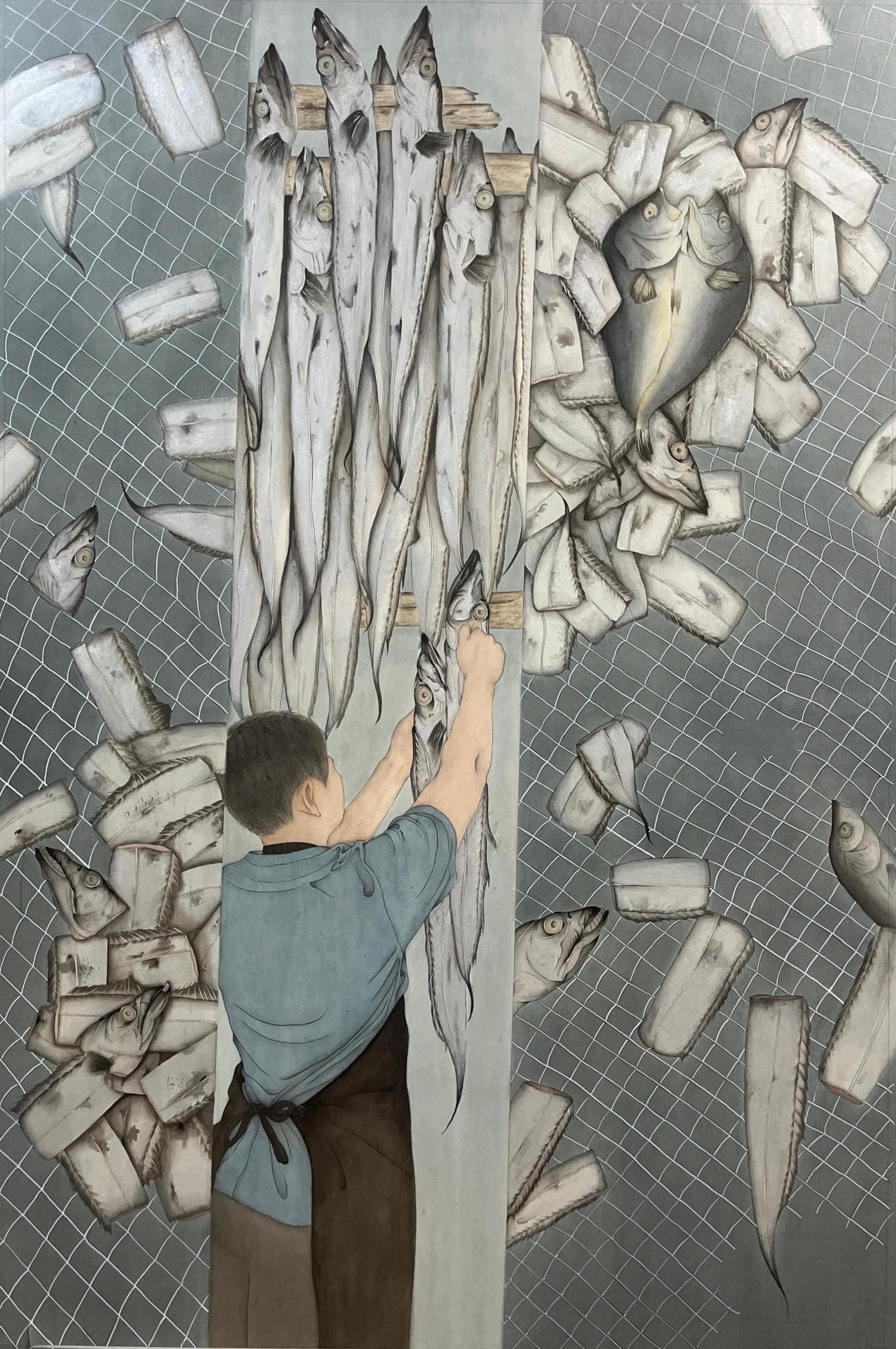《一渔一网鱼》 马梅花 工笔设色 120cm×180cm 2023年