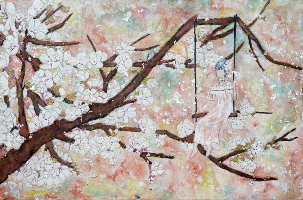 《花觅》之杏花 柯钿钿岩彩 40cmX60cm 2023年