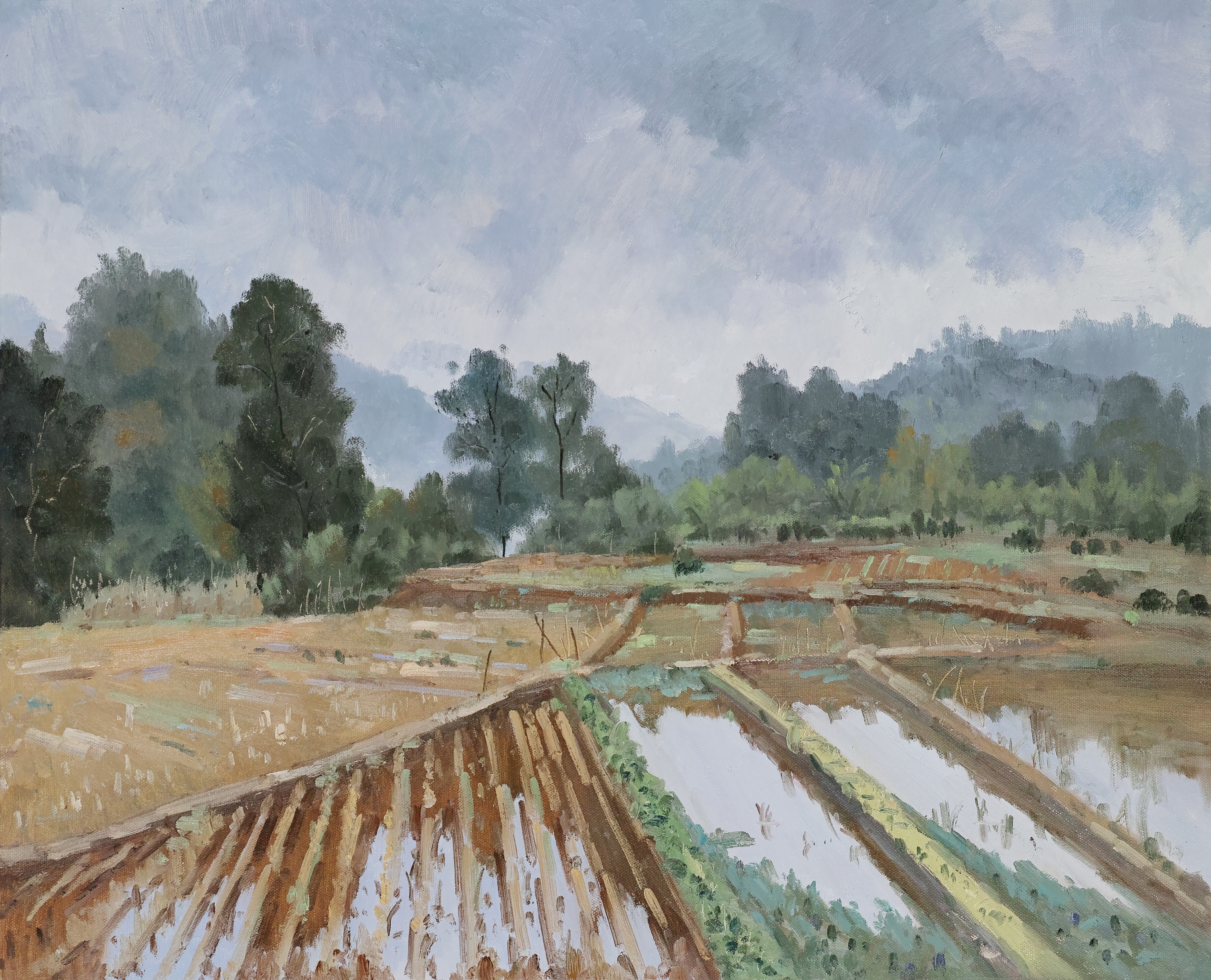 此作品是油画风景创作。在处理边缘线时试图在平面化与丰富性之间找到平衡点。表现对象是传统的自然风景,希望通过油画风景表达对音乐的感受:用指挥一场演奏般的笔触处理近处的草丛,用低音与高音般的反差来表达色彩的边缘,用架构和谐旋律的音程来丈量远近虚实,用繁而不乱的圆点编排大珠小珠落玉盘。