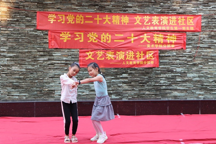 本次活动由人文教育学院党员、师生共同参与,通过发挥学院师生的专业特长,以歌舞、戏曲、朗诵等老百姓通俗易懂、喜闻乐见的文化艺术表演形式,向社区群众宣传党的二十大精神,唱响时代主旋律,进一步激励广大人民群众坚定不移跟党走,为新时代幸福生活接续奋斗的理想信念。