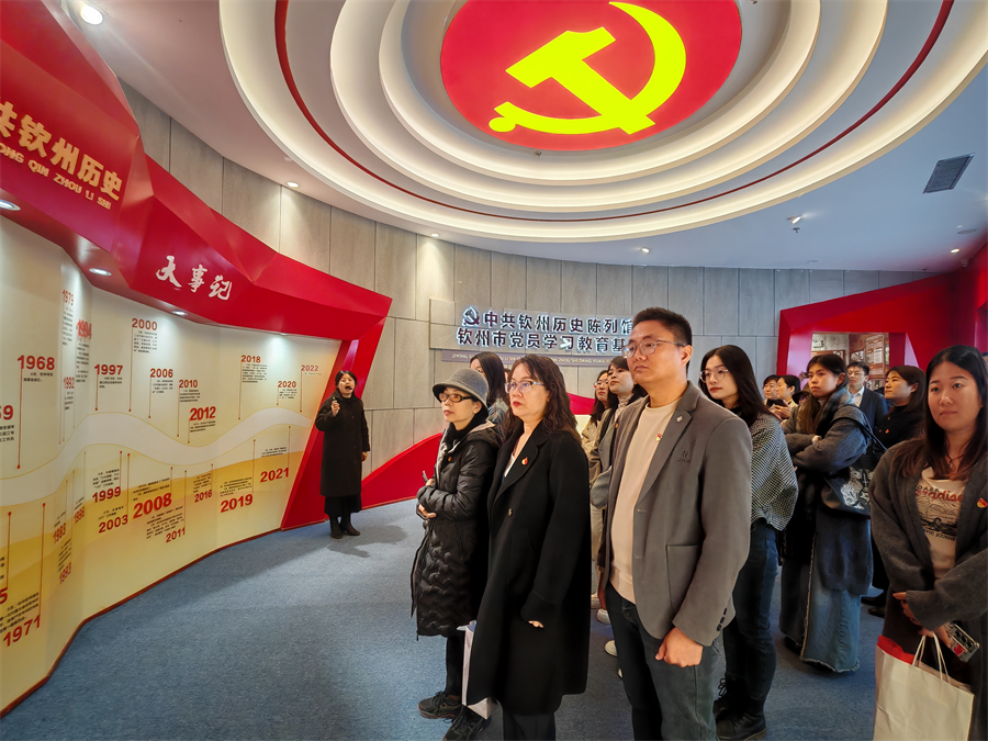 第一站参观了中共钦州历史陈列馆。陈列馆内丰富的史料与鲜活的展览生动呈现了钦州人民在中国共产党引领下波澜壮阔的革命斗争画卷。党员们专注聆听讲解员讲述,目光在每一件文物、每一张照片上停留,深刻体悟先辈们为民族独立和人民解放奋勇拼搏、舍生忘死的伟大精神,从中汲取前行力量。全体党员重温了入党誓词,铮铮誓言回荡在馆内,彰显着党员们不忘初心、牢记使命的坚定信念。