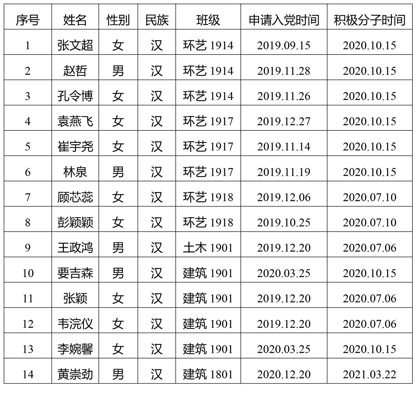 在征求党小组和党员、群众意见的基础上,经支部委员会审查,拟将张颖等14位同志列为发展对象人选。根据发展党员工作有关要求,现将其有关情况公示如下,经党支部培养教育和考察,该同志已基本具备党员条件,在征求培养联系人、党员和群众意见的基础上,经中共北海艺术设计学院建筑与环境艺术学院学生第二支部委员会2022年4月22日讨论同意列为发展对象人选。