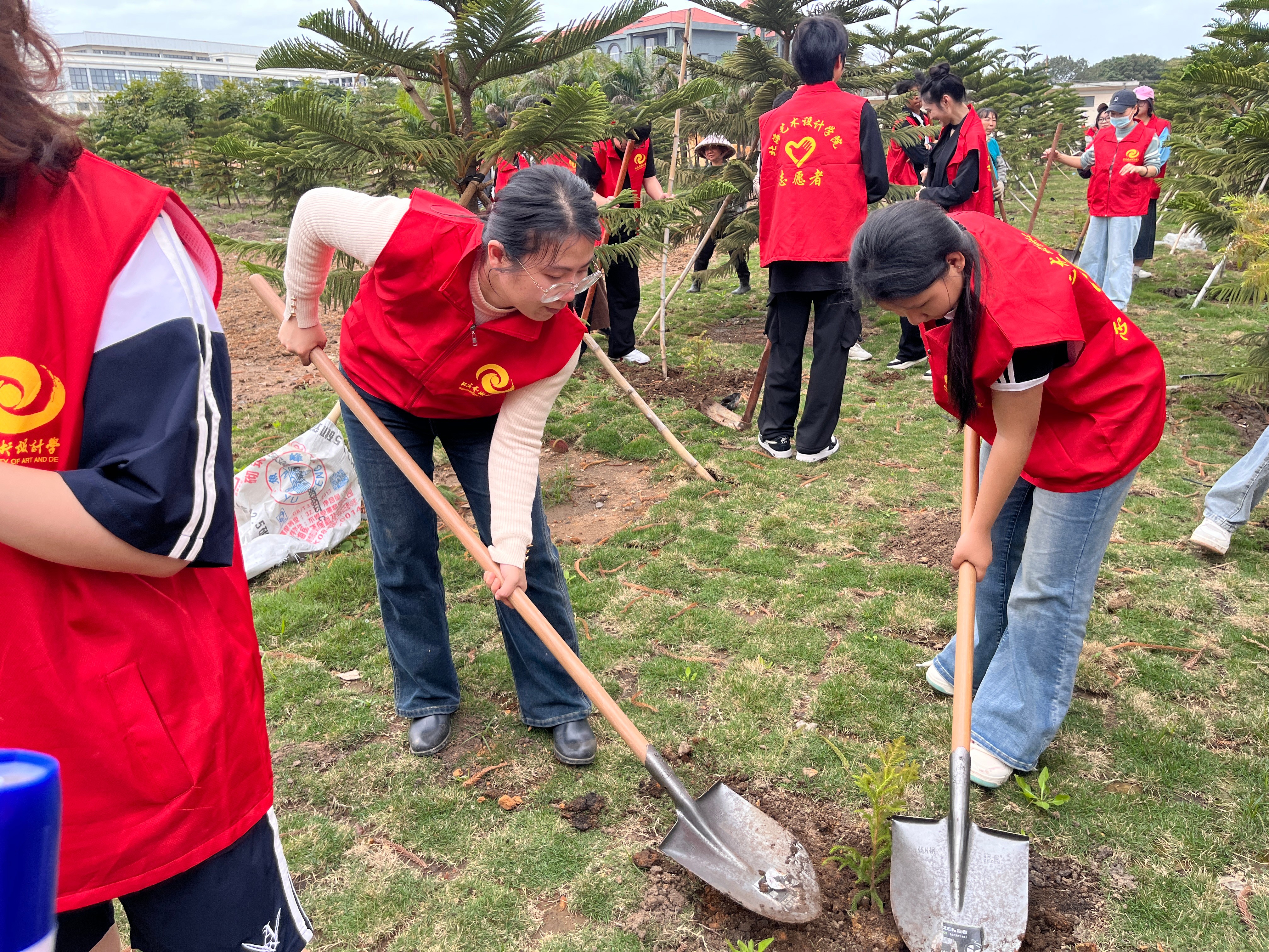 志愿者们怀揣着热情与期待,手持工具迅速投入热火朝天的植树活动中。挥锹挖坑,放苗入坑,小心扶正,填土夯实,提桶浇水,他们分工协作,默契配合,井然有序,合力完成每一道植树工序。