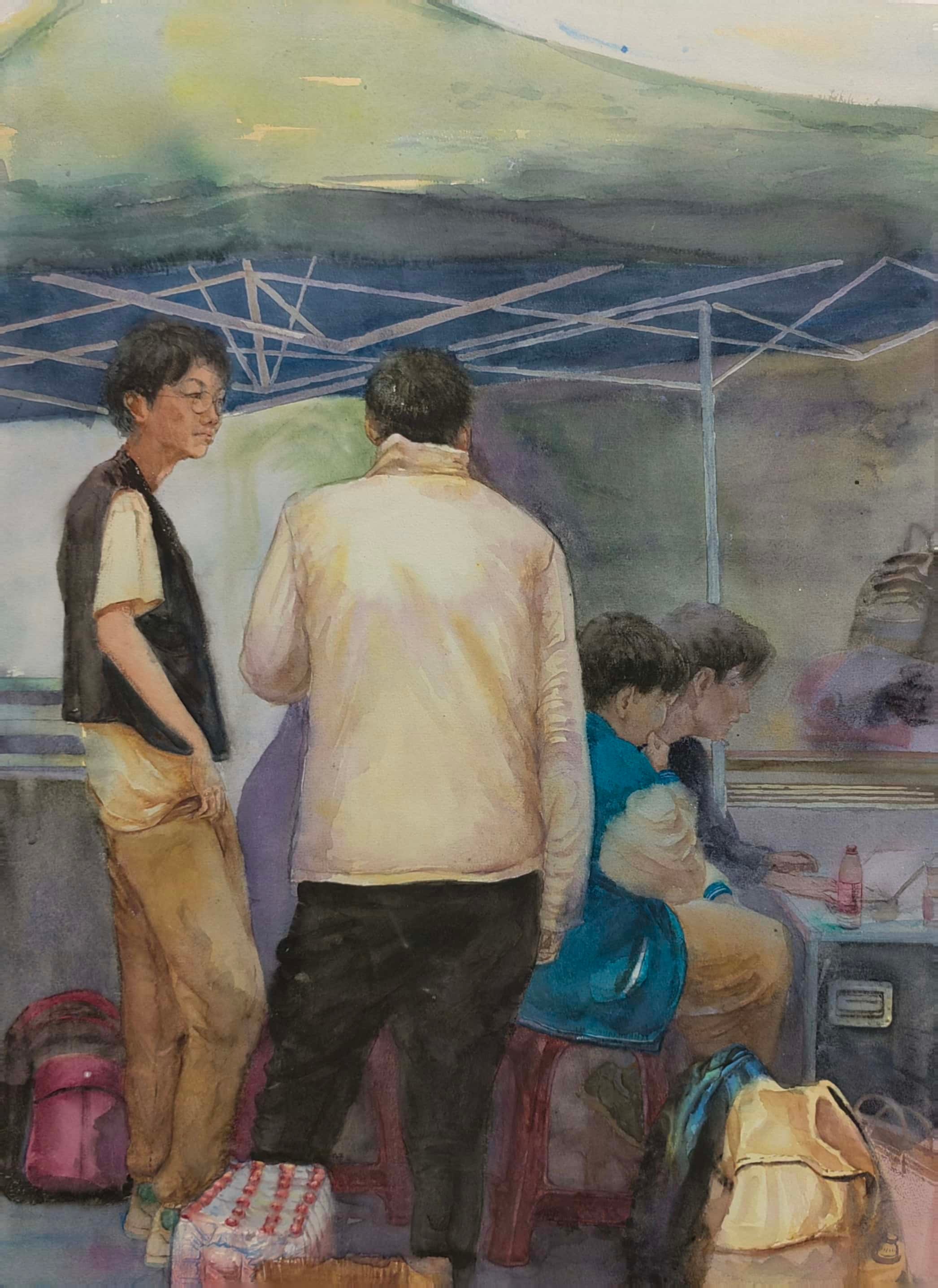 杨嘉丽《工地的午餐》52cm×74cm 2023年 纸本水彩