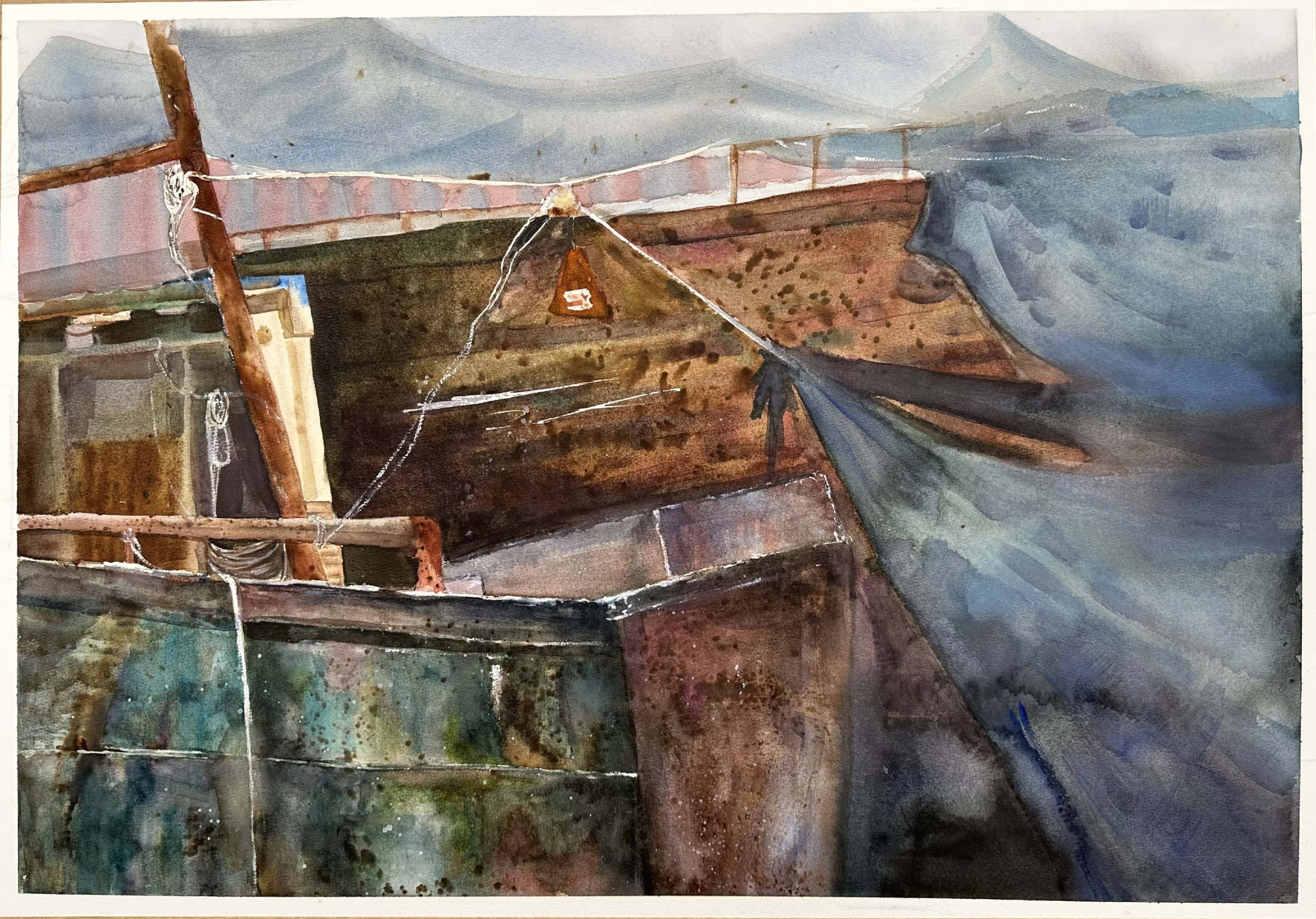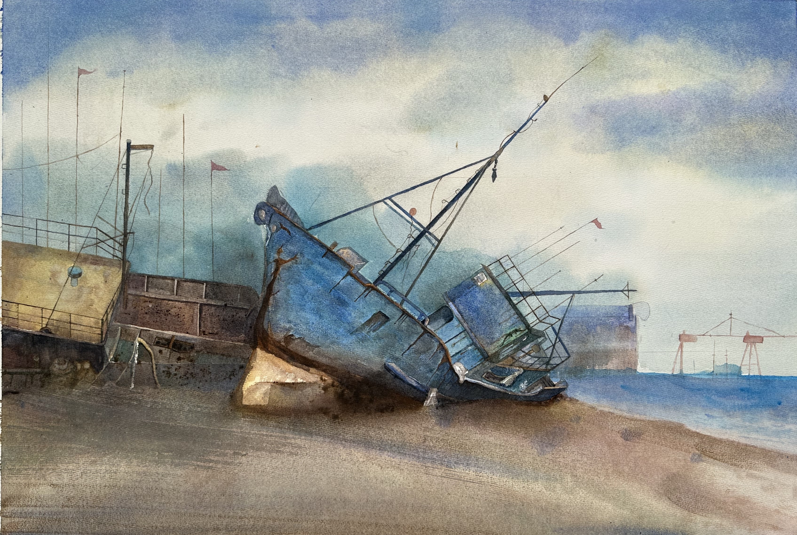 罗永在《搁浅的船》 49cm×72 cm 2023年 纸本水彩
