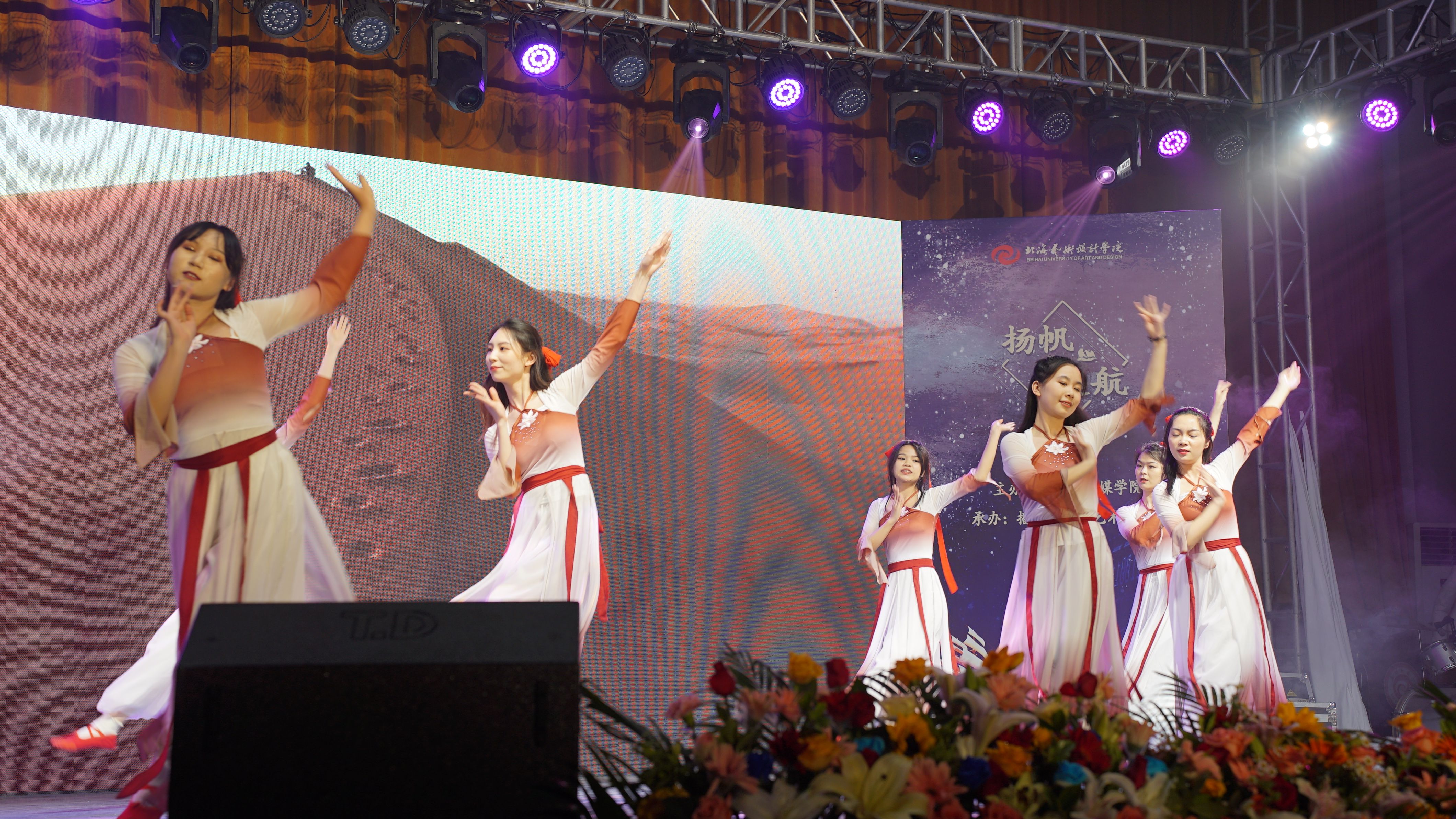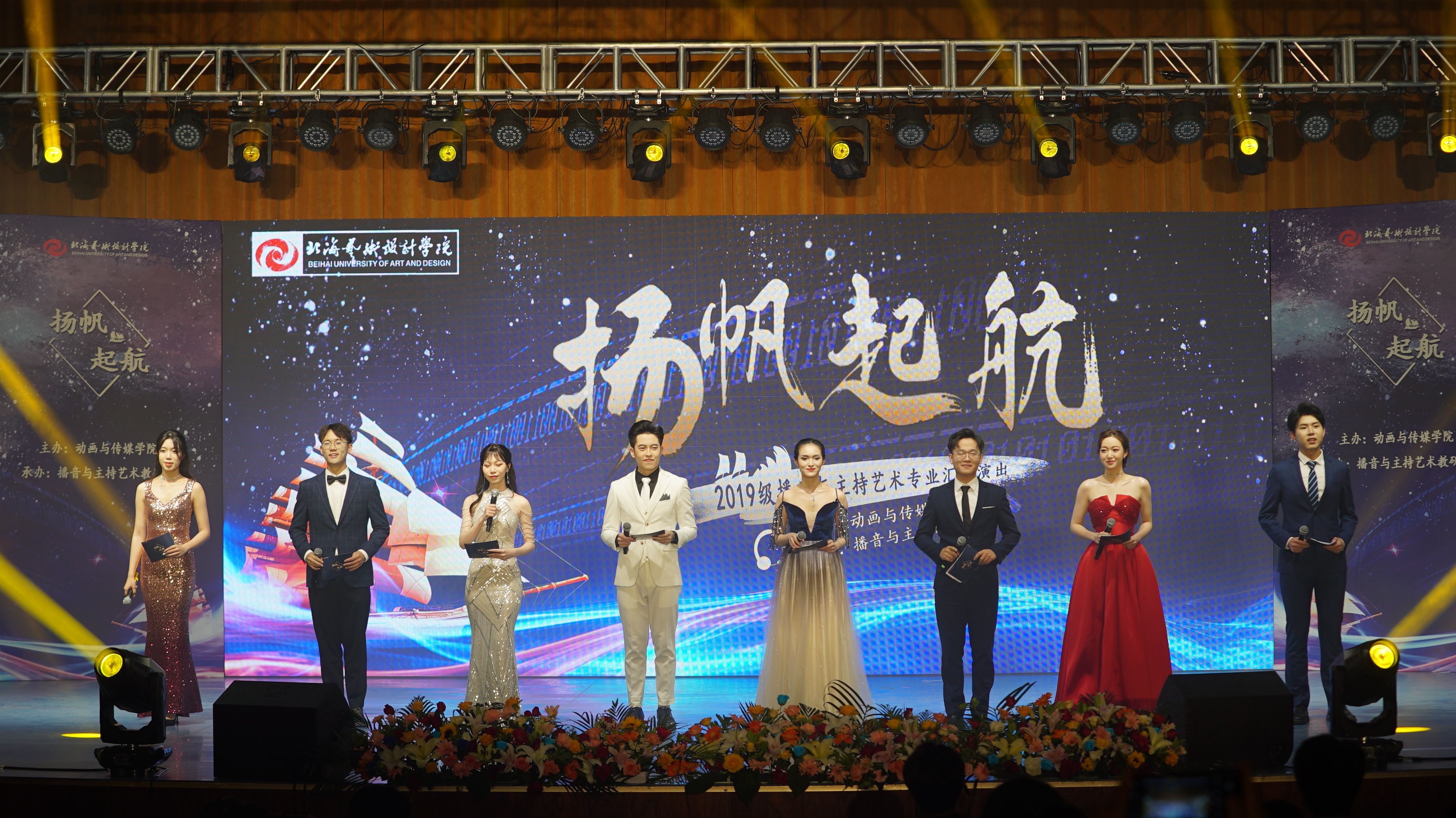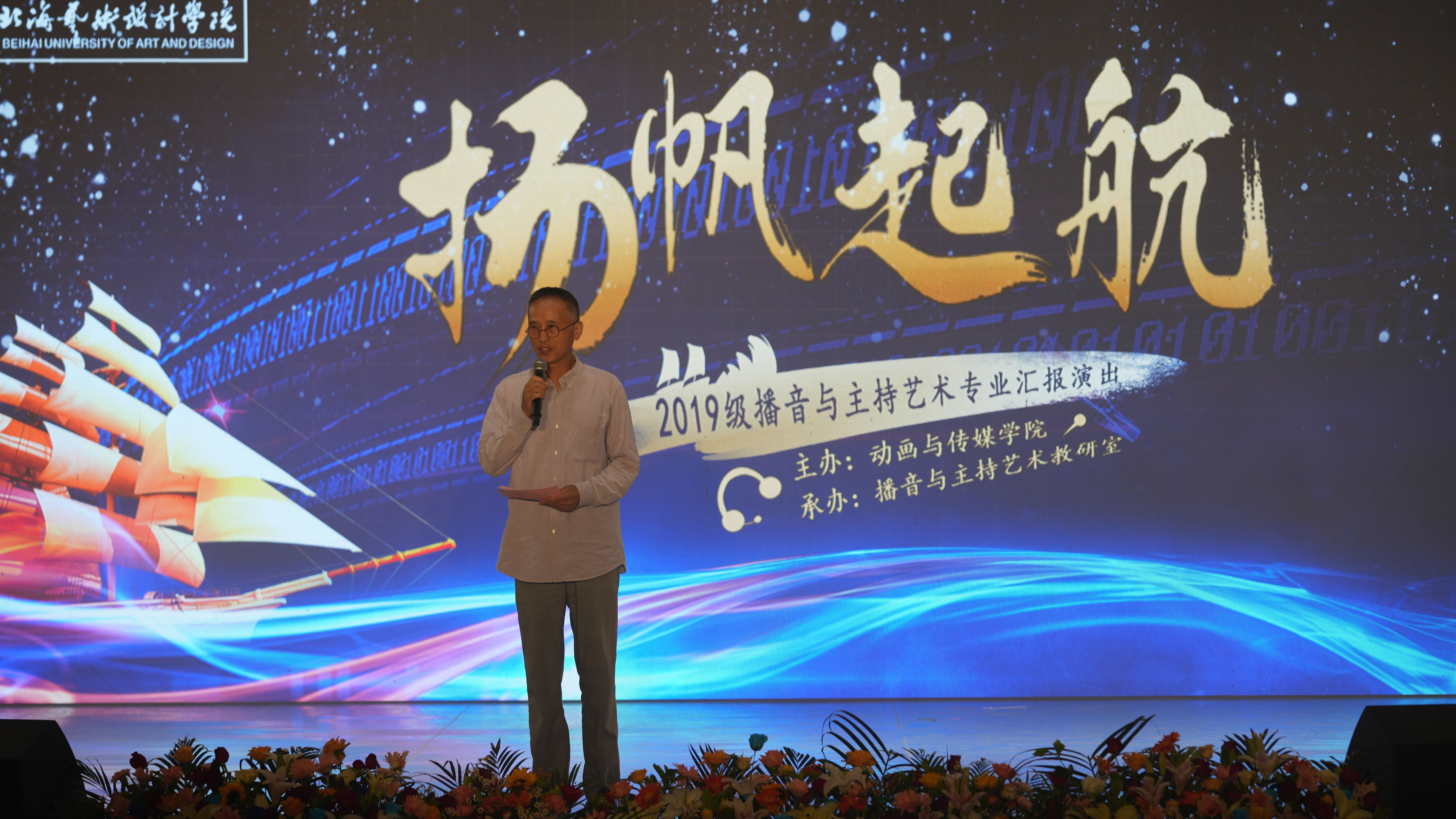 5月30日晚,由北海艺术设计学院动画与传媒学院主办,播音与主持艺术教研室承办的“扬帆起航”——2019级播音与主持艺术专业汇报演出在学校大礼堂举行。校党委书记张阳、校长卢新华董事长副校长郑念贻党委副书记副校长彭仁、党委副书记韦静月、副校长王斌、陶立阳、刘朝雄、马克思主义学院院长姜献生、公共部主任杨莹、动画与传媒学院党总支书记孙永辉、院长庞定坤、副院长杜博、杨红夷和校企合作单位北海广播电视台台长高峰等领导莅临现场指导,观看晚会的还有动画与传媒学院的师生们。