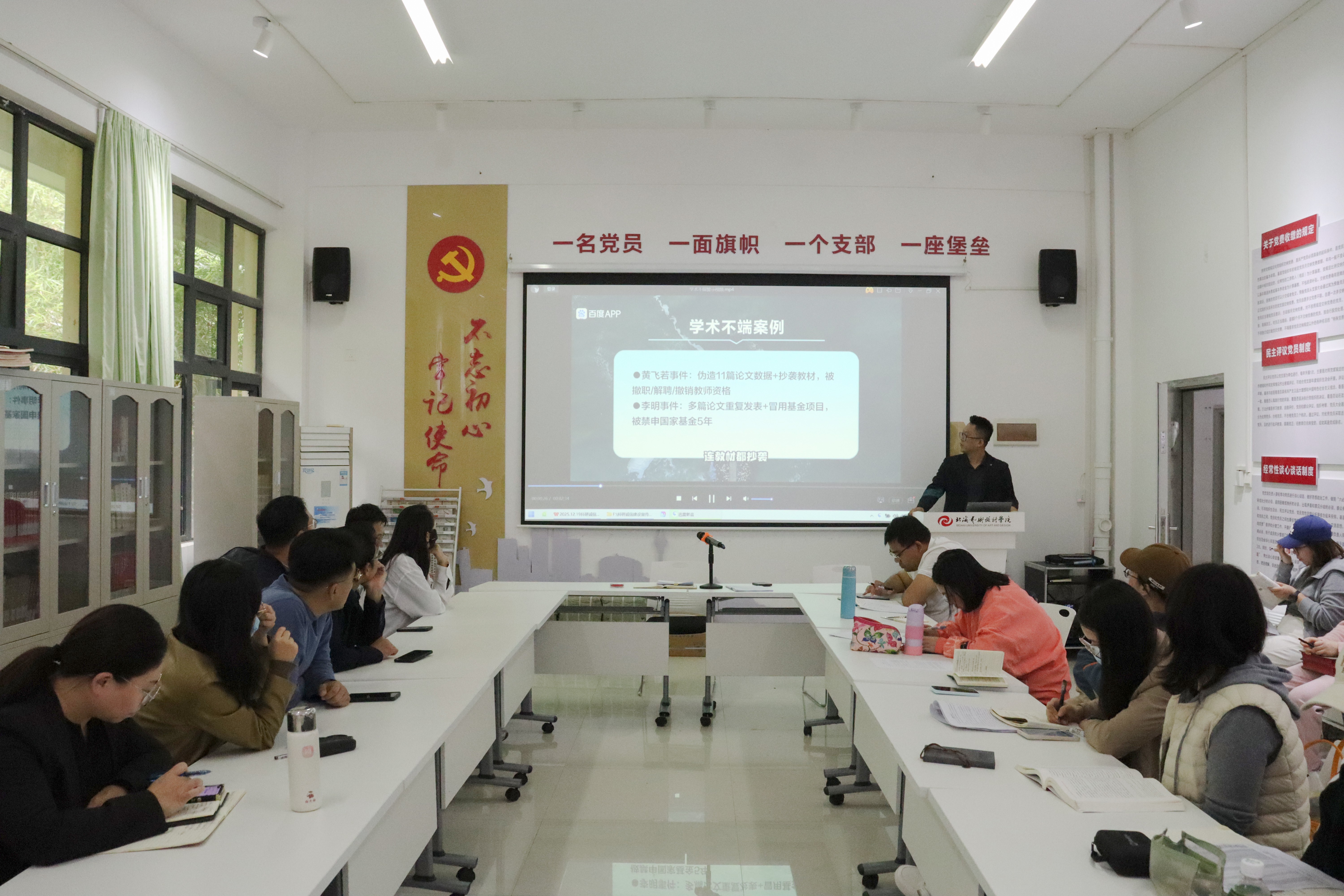 其次,他和全体中青年教师一起学习了《教育部关于加强高等学校科研诚信建设和学术不端治理的指导意见》《高等学校预防与处理学术不端行为办法》《学术出版规范 期刊学术不端行为界定》等文件,他以AI生成论文作为案例,现场阐释了此类论文存在的学术隐患,提醒大家要时刻警惕新型学术不端风险。紧接着,大家集中观看了科研诚信警示教育短片,进一步增强了教师对科研诚信“红线”“底线”的敬畏之心。