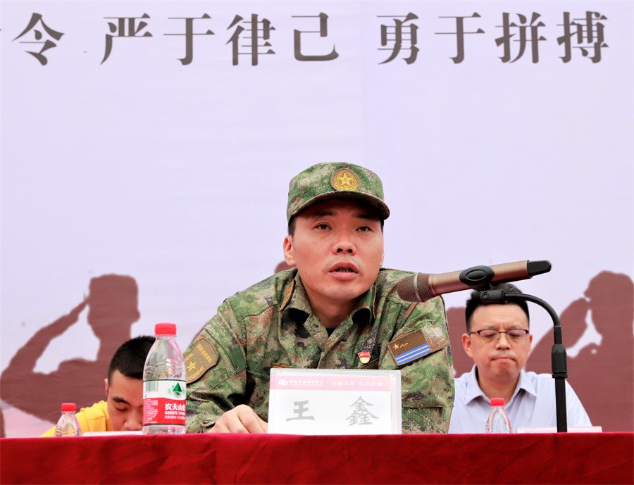 北海市海城区人民武装部政委王鑫在讲话中阐述了军训的重要性,通过军训进一步增强学生的国防知识和军事技能,引导学生在军事化管理中培养良好的生活学习习惯,在感悟军人使命、体验部队式生活中加强使命担当,激发保家卫国的责任感,也在军训后变得更加勤奋坚强。他希望同学们能端正参训态度,保持高昂热情,展现迷彩在身的无上荣光;保持坚韧毅力,刻苦认真训练,培养永不言弃的精神高地,服从教官管理,严格自身要求,养成令行禁止的优良作风;团结奋斗、加强互帮互助,打造坚强有力的和谐集体;以此次军训为契机,以中华民族伟大复兴为己任,做一个自信阳光、善良正直、勇敢睿智的人,积极传播正能量,为社会贡献力量。他还对全体军训教官提出要求:要准确把握、严密组织、稳妥推进,在严格要求中科学施训,在要求效果中注重过程,在训练内容中保障安全。