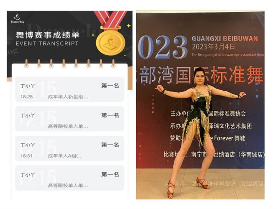 3月4日,中国·广西首届北部湾国际标准舞全国公开赛在广西南宁正式开赛。由人文教育学院舞蹈表演专业(国标舞兼修)学生潘宏、丁小丫、王雨嫣、王雨桐组成的北海艺术设计学院国标舞代表队,在青年教师李晓飞和周琦涵的带领下出战比赛,一举斩获冠军8项、亚军2项、季军2项、殿军1项的佳绩。