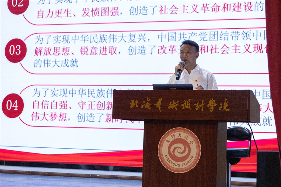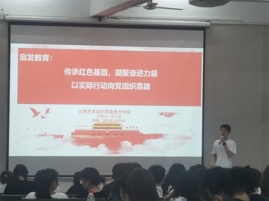 第三党总支书记孙永辉结合学院特点,以学院与北海市委网信办合作的微电影《Hello!BeiHai~你好!北海》作为开场,为同学们讲述中国共产党自建立以来经历的种种磨难以及做出的一系列重要决策,同时对党员标准和入党的基本条件等问题进行了深层次的阐释,告诫同学们要坚持共产主义远大理想,加强政治理论学习,从身边点滴做起。