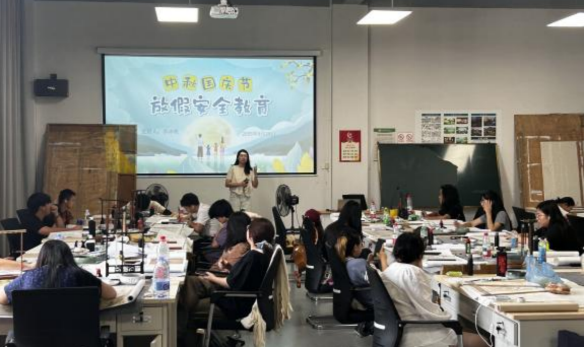 为切实做好中秋、国庆假期学生安全工作强化学生安全意识,筑牢假期安全防线,2025年中秋、国庆假期前夕,美术学院组织开展安全教育主题班会,会议围绕离校返校交通、人身财产、防火防盗、防诈骗、防溺水、出行旅游六大模块进行,各班级辅导员主持会议,全体学生参加。
