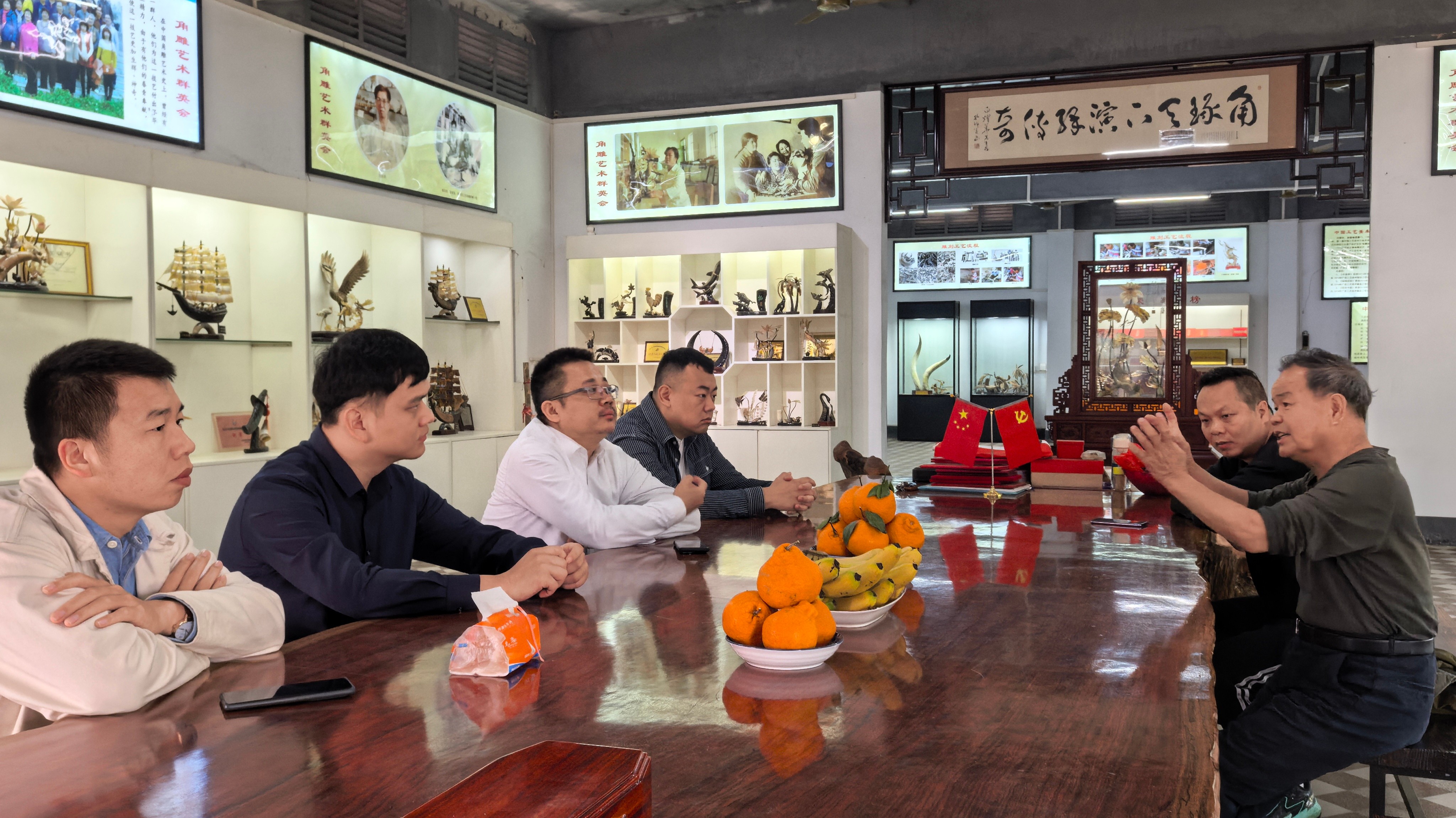 上午9时30分,学院一行首先抵达合浦金蝠角雕有限责任公司。作为传统工艺的杰出代表,角雕艺术在这里焕发出独特魅力。学院领导与企业负责人就合作事宜展开深入交流,不仅提及鼓励学院师生参与广西工艺美术大赛,企业负责人有望担任评委,为大赛注入专业力量,还针对雕塑课程教学达成共识。学院计划安排相关课程,带领学生亲身体验角雕艺术,深入了解角雕材料及简单技法,并指导学生创作作品参赛,从大学一年级开始,将雕塑专业学生分批培养,设定主题作业,按照比赛要求进行系统培训,共同推动非遗创作的传承与创新。企业方面也分享了大师带领师生获奖的经验,双方期待通过紧密合作,实现共同目标。