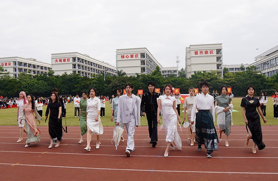 穿着旗袍的模特迎面走来,每一位模特的服装都由设计艺术学院服装设计专业的学生设计制作而成,每一位模特的动作都经过精心考量,模特们用自信的步伐和优雅的姿态向观众展示了服装设计的魅力与我院学子深厚的专业功底。
