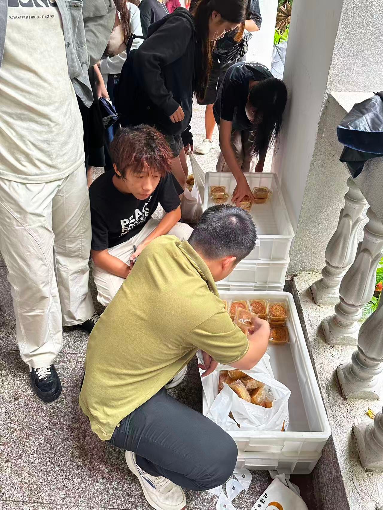 发放点设于学生工作处,现场气氛热烈、秩序井然。一盒盒精心包装的月饼,一只只色泽金红、皮脆肉嫩的烧鹅,不仅传递了节日的问候,更是一堂生动的“舌尖上的文化课”,于细微处彰显学校育人工作的温情与匠心。我院分管学工副院长韦志忍带领辅导员亲手将节日福利送至学生手中,并与学生们亲切交流,详细了解大家近期的学习与生活状况。同学们纷纷表示感谢,现场洋溢着温馨与喜悦。
