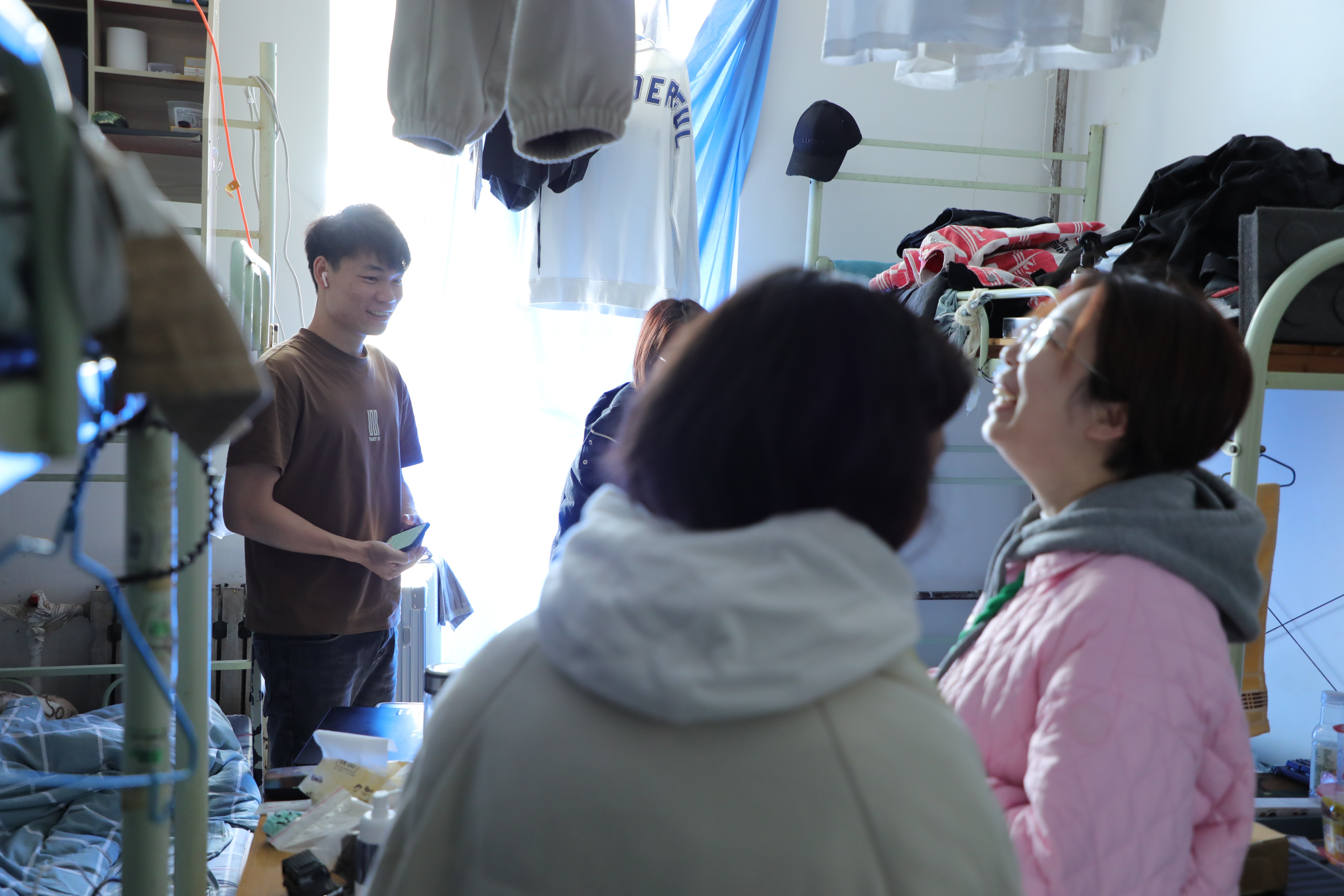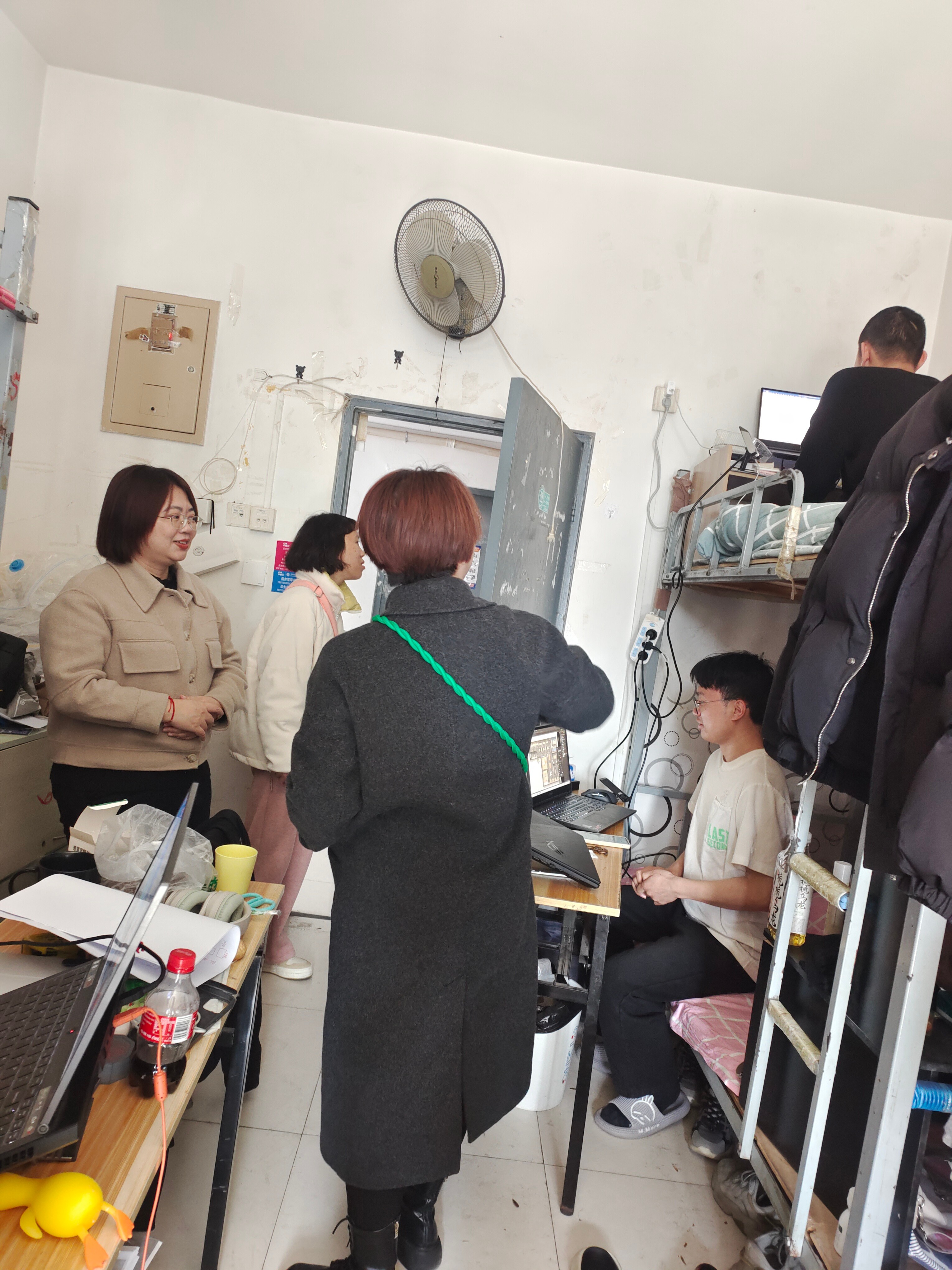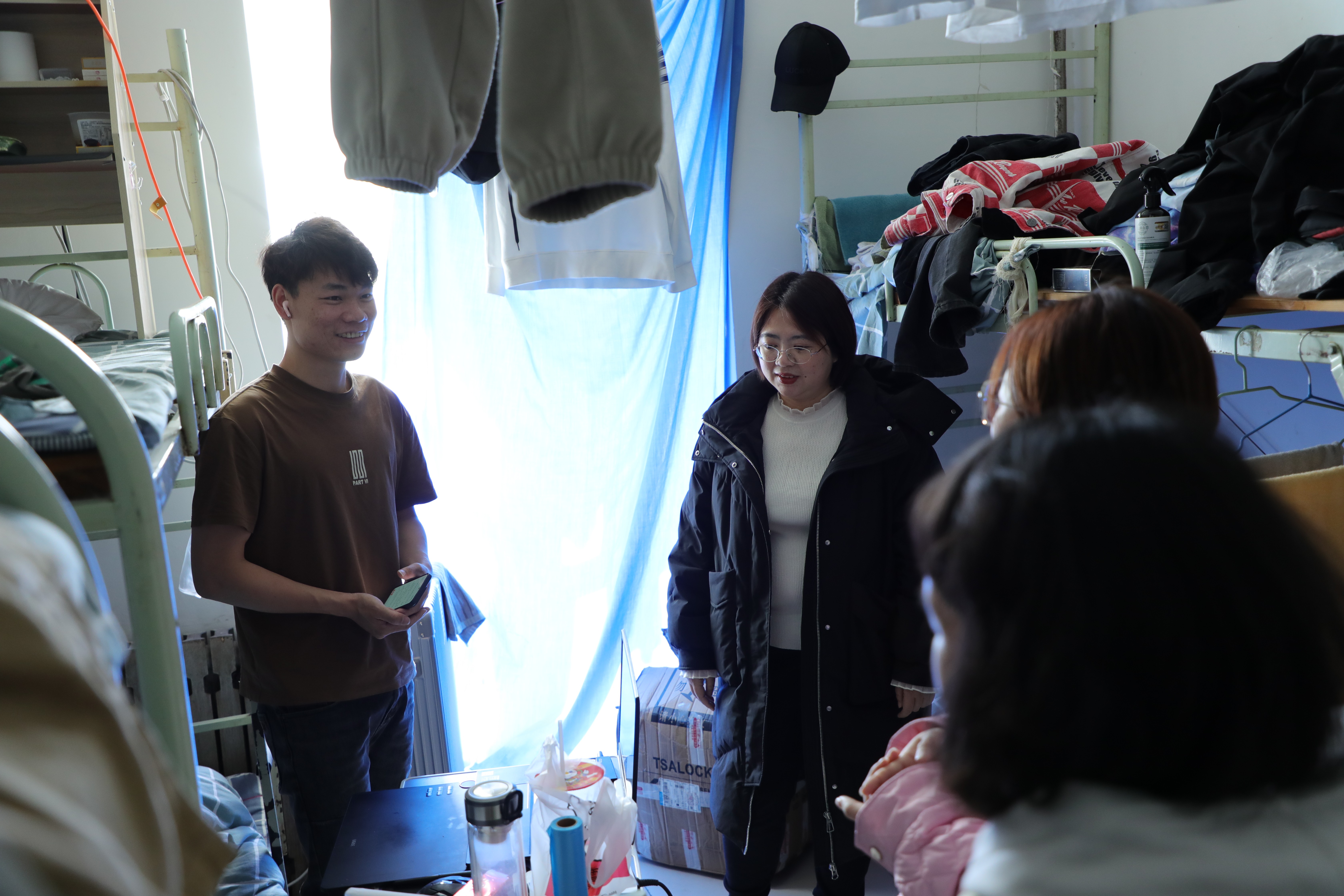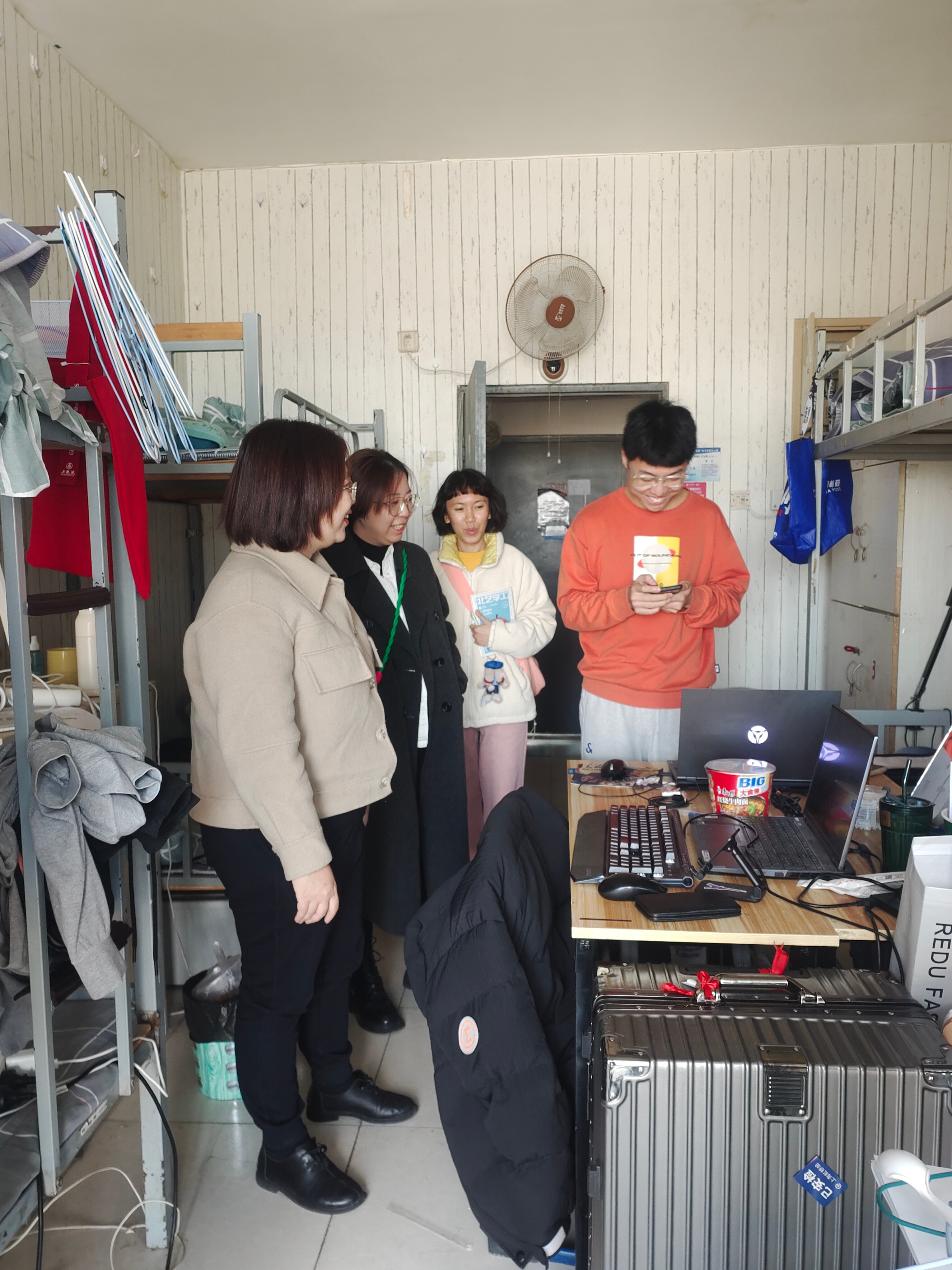 随后,学生工作处一行走访了基地教学实训教室、学生宿舍和学生食堂等场所,实地了解了学生在京实践过程中的具体情况。在走访学生宿舍时,学生工作处各位老师与学生展开了亲密的交谈,对于学生上京后的心理变化、生活适应情况、毕业作品等方面的情况进行了细致了解。