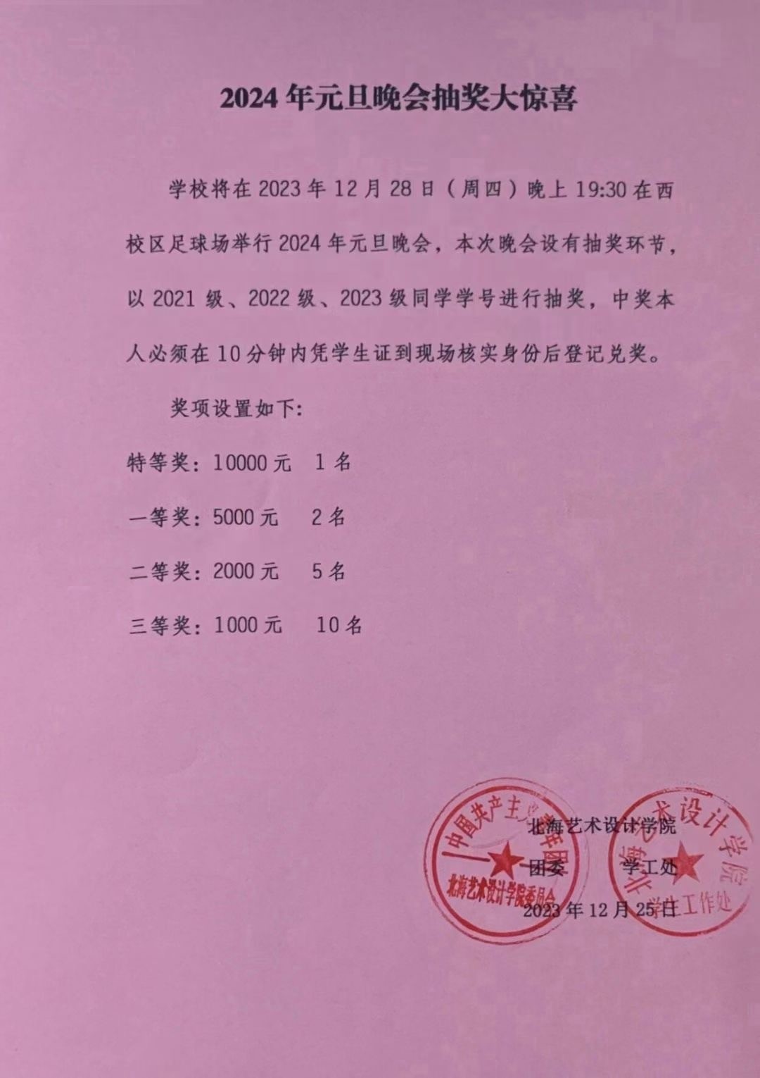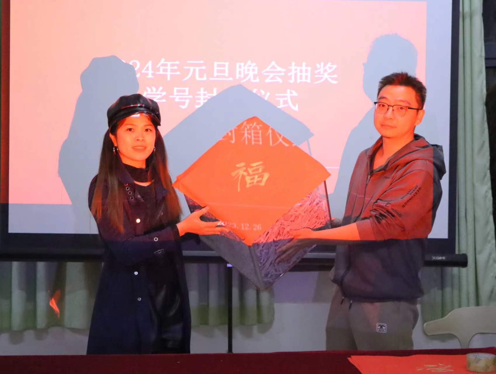12月26日在行政楼118开展2024年元旦晚会抽奖活动封箱仪式,出席本次仪式的有:学工处副处长马啸老师、团委副书记宋慧敏老师、团委副书记杨美琪老师以及各二级学院学生代表。