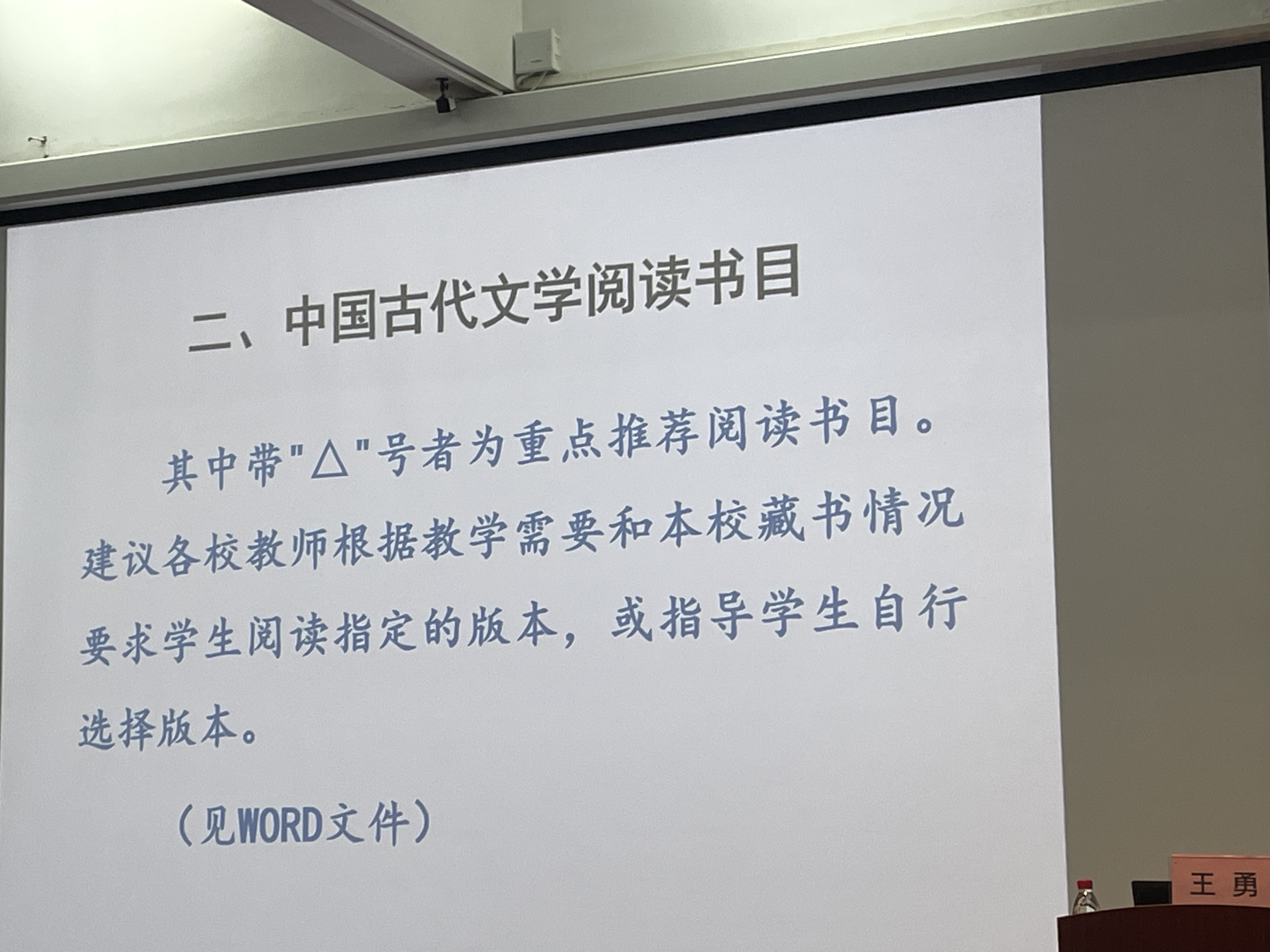 在讲座中,王勇教授向同学们推荐了中国古代文学阅读书目,如《中国语言文学系学生阅读书目·中国古代文学类》(修订本)和《高等学校中文专业阅读书目》(中国古代文学部分),另外,还给同学们分享了教育部及各高校推荐学习的古代文学电子资源。王勇教授详尽分析了当下市场上的古代文学学习资源,希望同学们能够择优阅读,珍惜时间,培养自己的文学素养。
