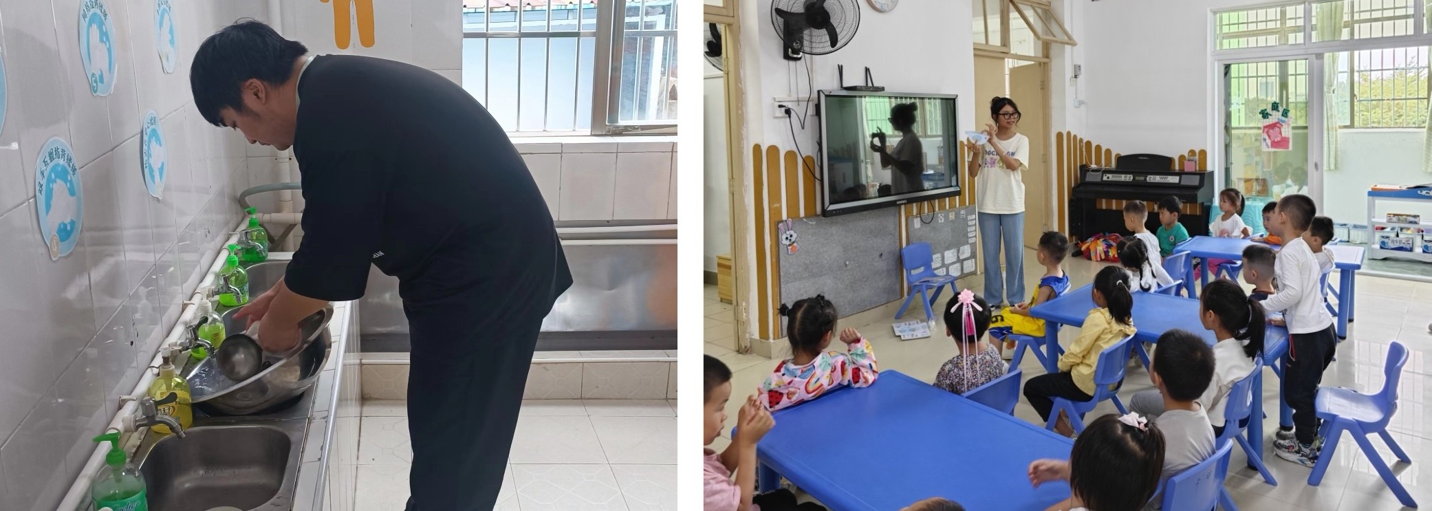 (2101班李晓宏参与幼儿园日常工作)                                    (2102班王梅枝参与教育教学)