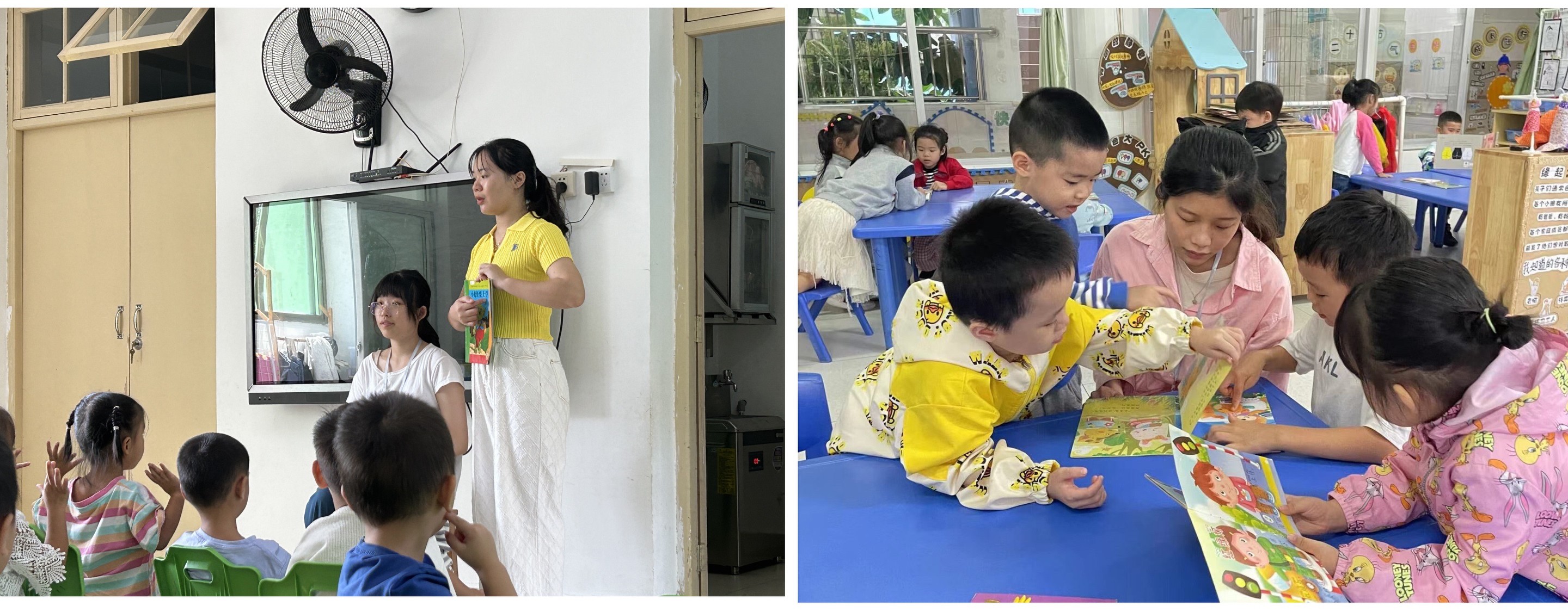 (2301班高淑婷与校外指导老师一同授课)                                                                              (2101班陈紫蓉与幼儿一同阅读)