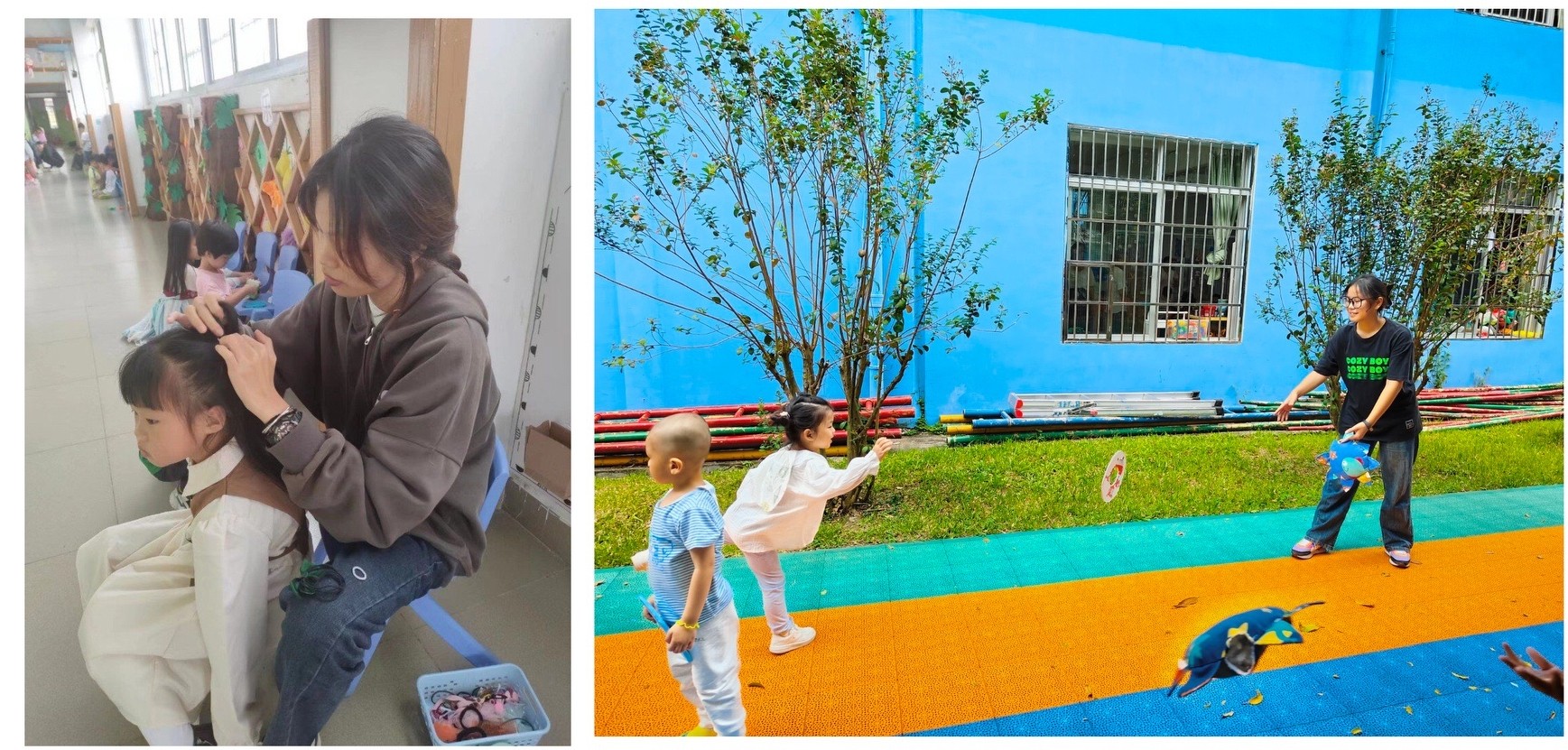 (2102班黎佳倩给幼儿梳头发)                                                                                                    (2201班陈婷影与幼儿游戏)