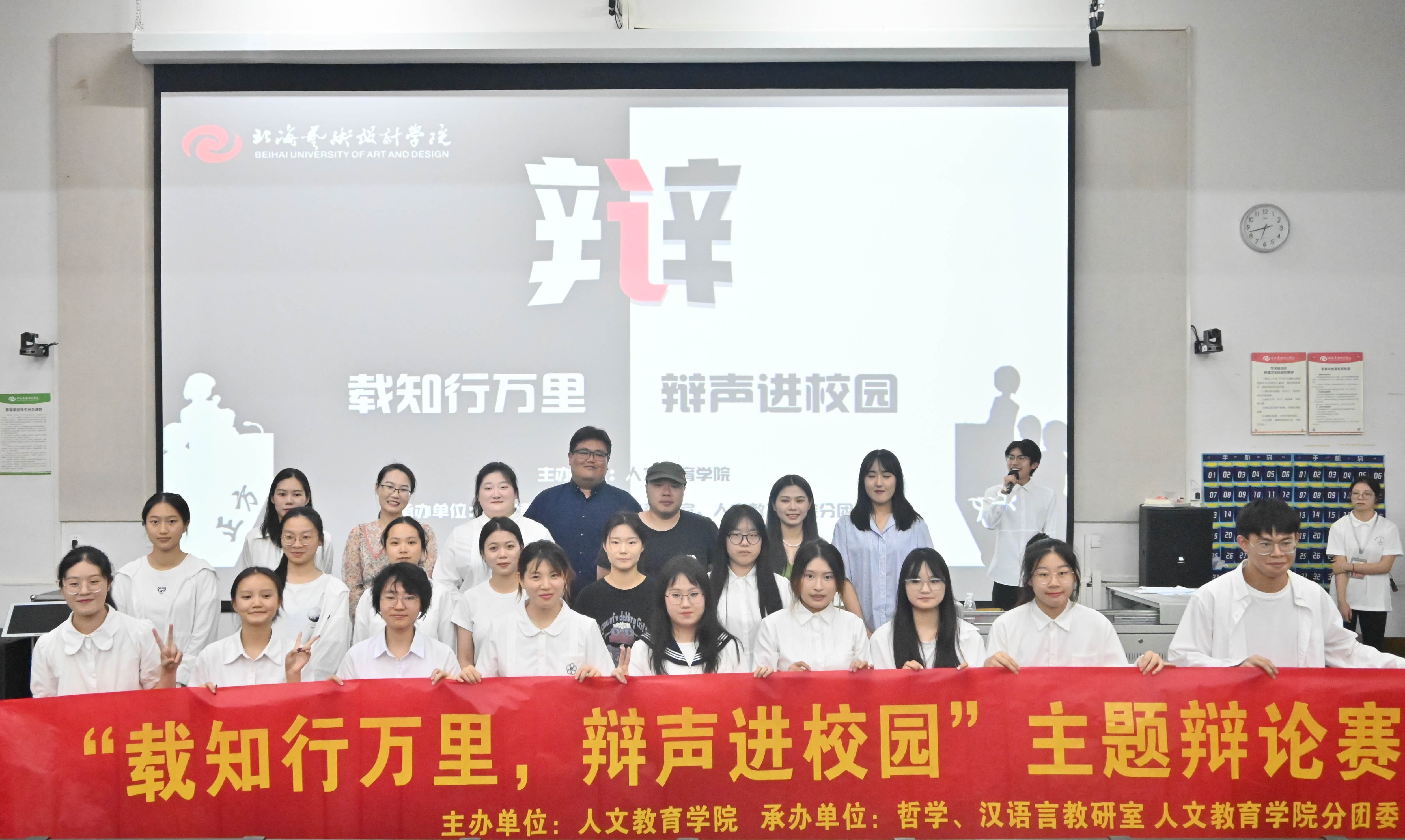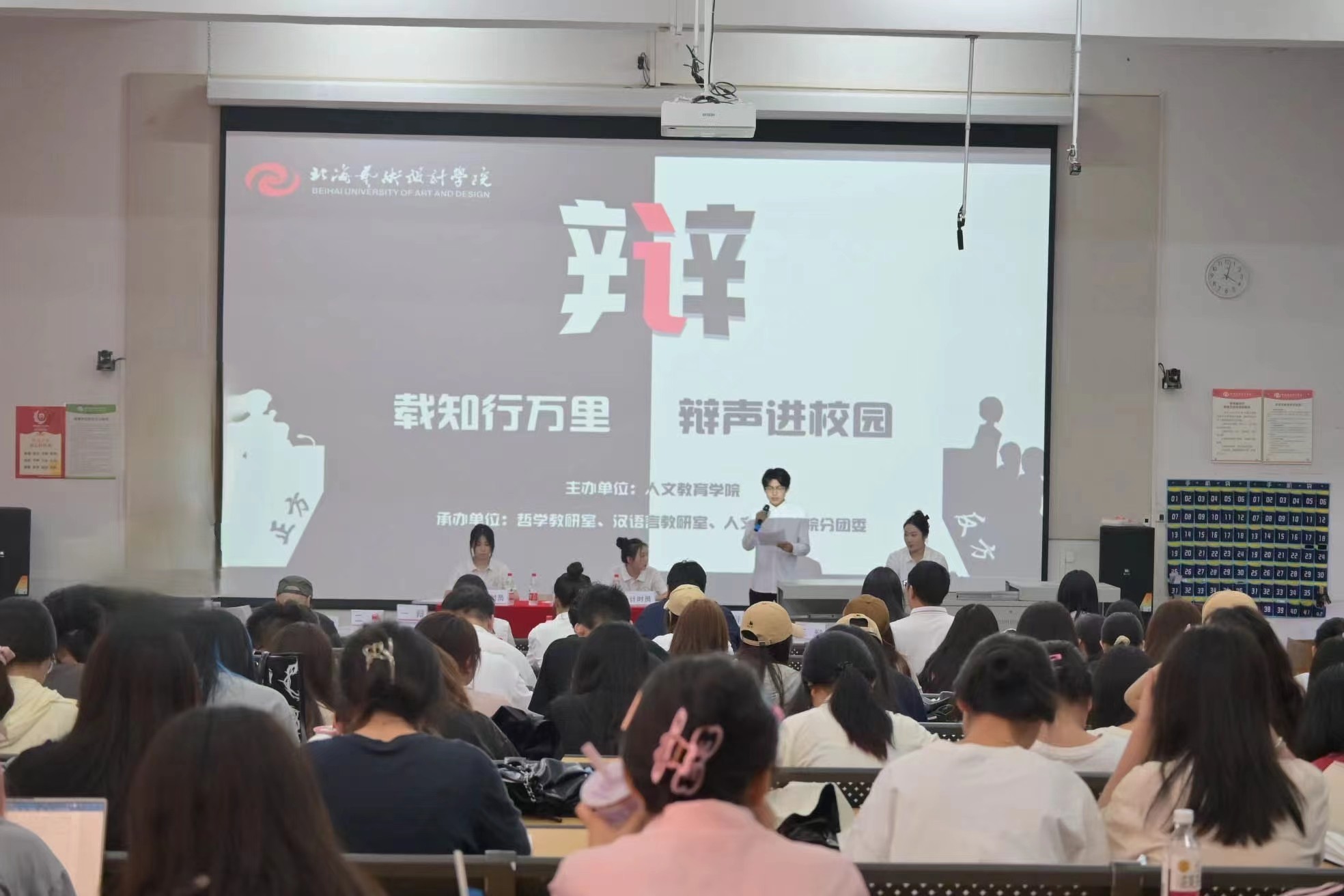 2024年4月27日,北海艺术设计学院人文教育学院“载知行万里,辩声进校园”辩论赛决赛于西校区功德楼107教室圆满落幕。此次辩论赛由人文教育学院主办,哲学、汉语言教研室、学院分团委共同承办。出席本次比赛的评委嘉宾有哲学教研室主任覃传茵,汉语言文学教研室主任姜玮,以及陈言、李麟渔、雷蕊老师。蒙剑英、孙开一、何广西、王雨晴老师作为本次参赛队伍的指导老师出席。