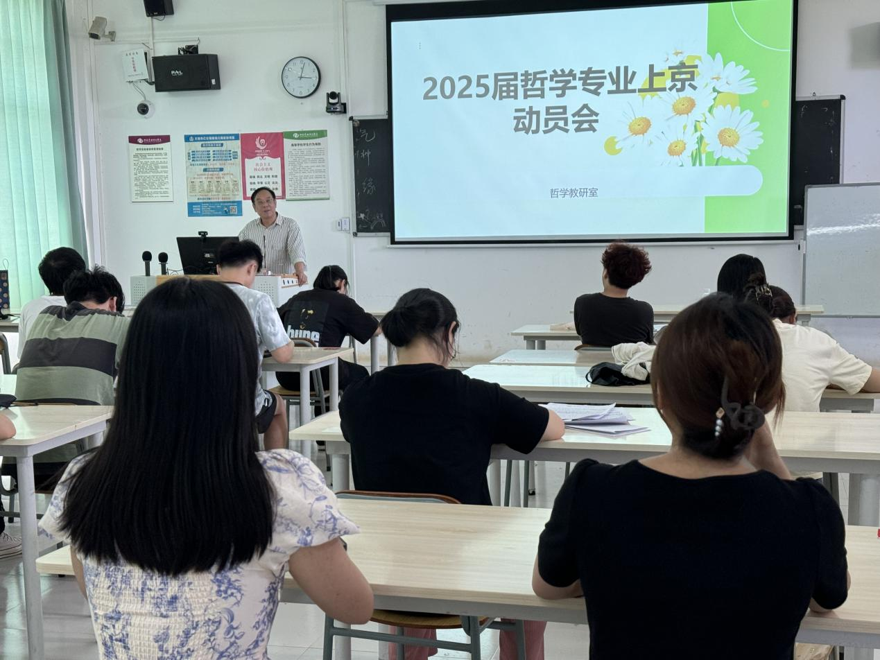 2024年5月31日下午,哲学学院哲学教研室开展了2025届哲学专业学生上京动员会。院长兼哲学专业学科带头人蒙绍荣教授、哲学教研室副主任覃传茵以及哲学教研室全体教师出席了本次动员会。会议由覃传茵副主任主持。
