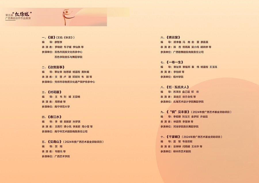 “红绣球”广西舞蹈创作作品展演旨在为全区舞蹈艺术工作者建高水准的竞技、展示平台,以赛促学、以赛育人,加大对广西舞蹈人才的培养力度,挖掘广西本土优秀舞蹈原创作品,推动舞蹈人才培育。