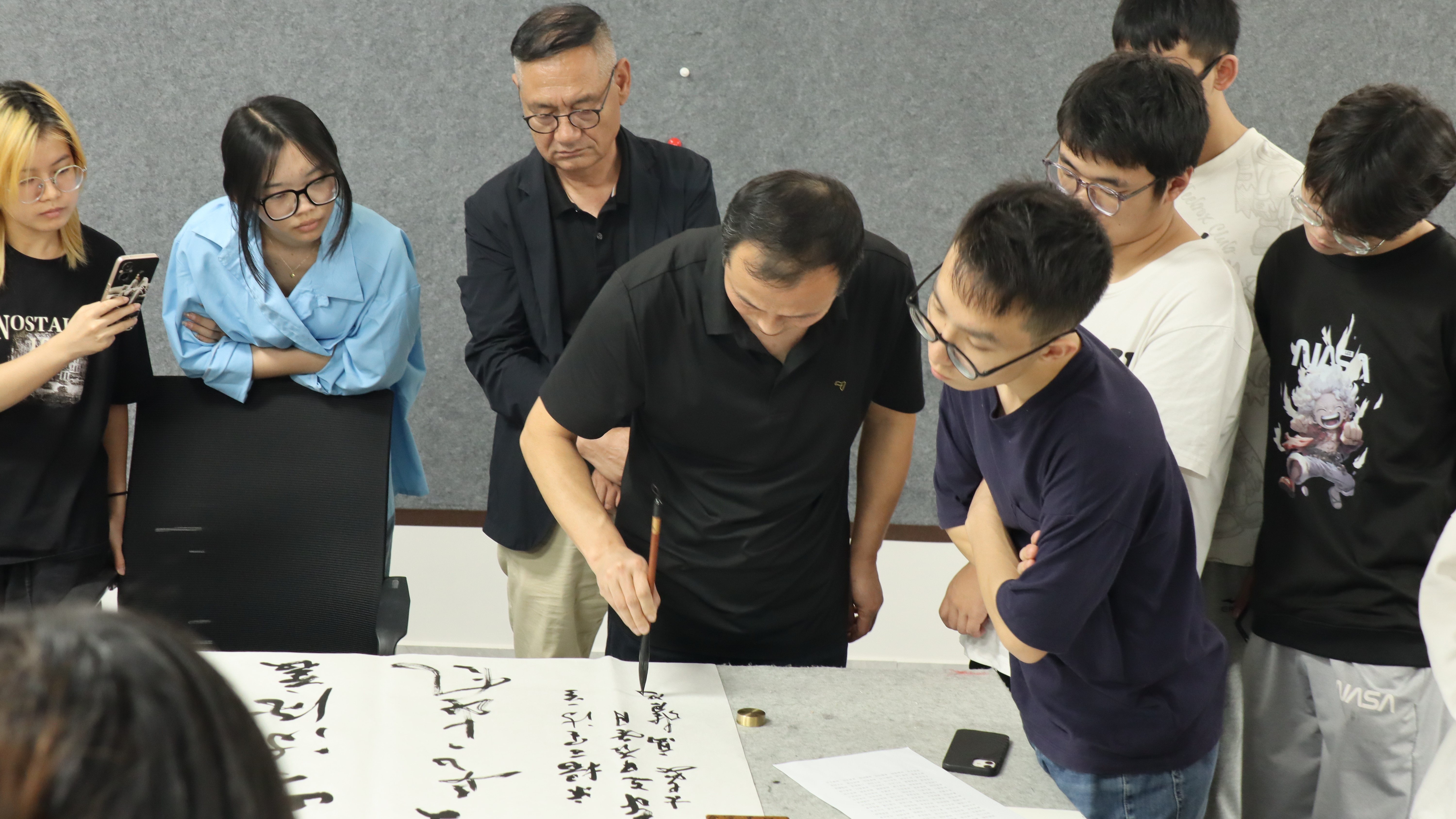 座谈会结束后,在书法学教研室开展书法交流笔会。书法家们挥毫泼墨,展示了各自精湛的书法技艺。同时,书法家们也鼓励在场同学拿起笔来,共同交流切磋现场墨香四溢,气氛热烈而和谐。