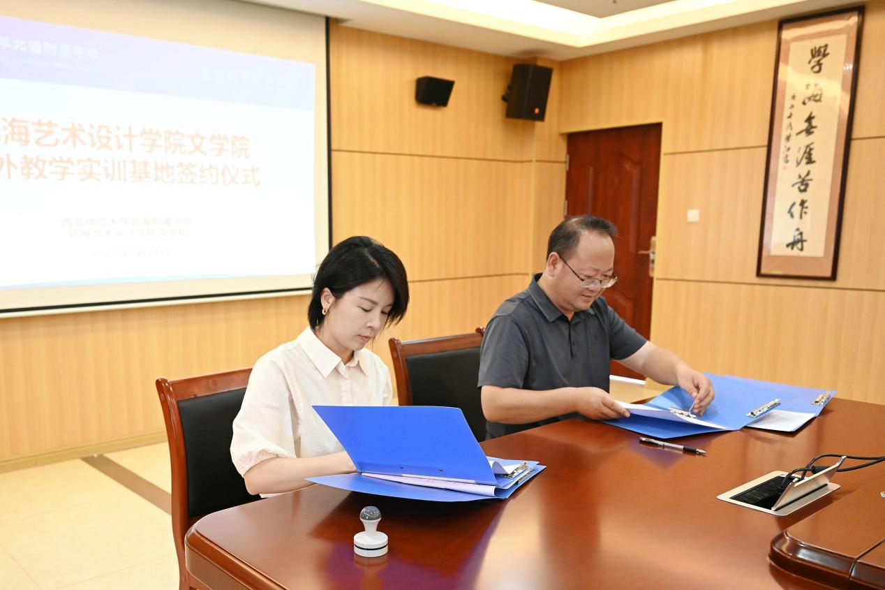 紧接着,双方共同签署了校外实训基地协议。根据协议内容,双方将在学生实习、师资培训等方面开展深入合作。文学院将定期选派优秀学生到西北师范大学北海附属中学进行实习,为中学课程教学提供必要协助并为中学教师提供专业培训和学术交流机会。西北师范大学北海附属中学将为文学院学生提供实习岗位和实践教学平台,并进行专业的培训和指导。