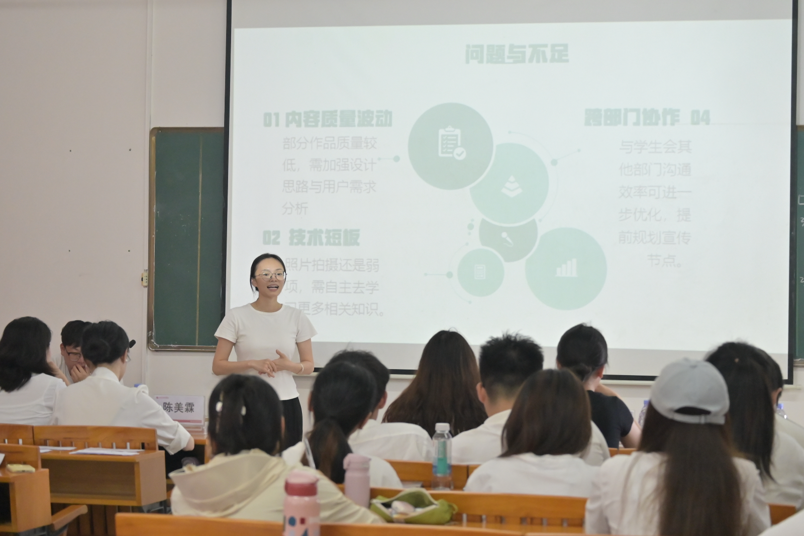 大会第五项议程是团总支指导老师陈美霖总结发言。陈老师肯定了团总支干部们过去一年的工作成绩,感谢大家的付出。同时,她从工作安排、机制建设和人员协作等方面分析了现存问题并指明改进方向。最后,她对未来工作提出建议:建立透明化反馈机制、推行“老带新”模式、强化自身建设、优化工作分配,希望大家认真思考、积极落实,推动团总支工作再上新台阶。