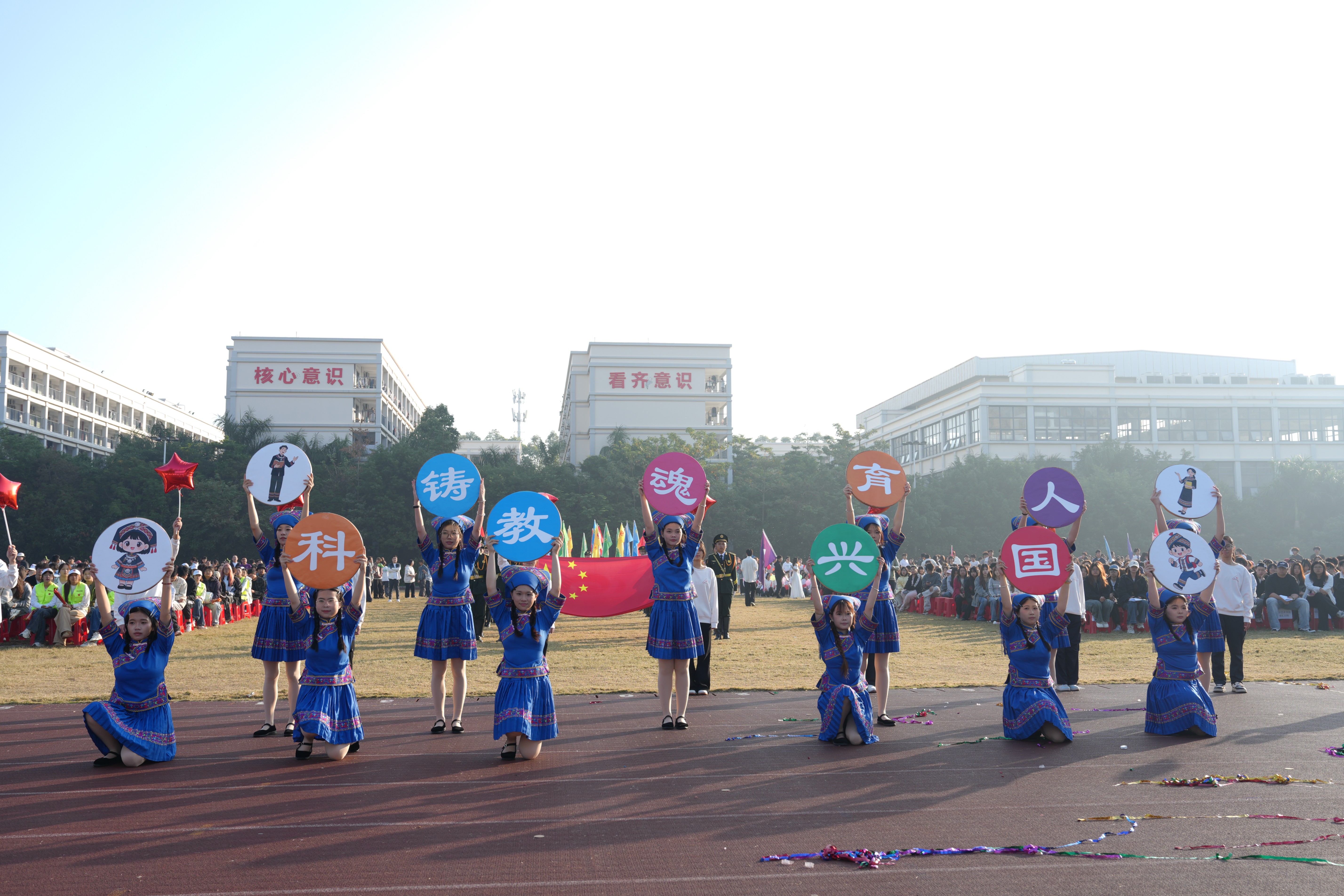 2025年12月19日至20日,我校第十七届运动会在东、西校区田径场顺利举行,教育学院全体师生积极参与并取得优异成绩。教育学院党支部书记黄思敏与学生代表共同参与开幕式方阵表演。