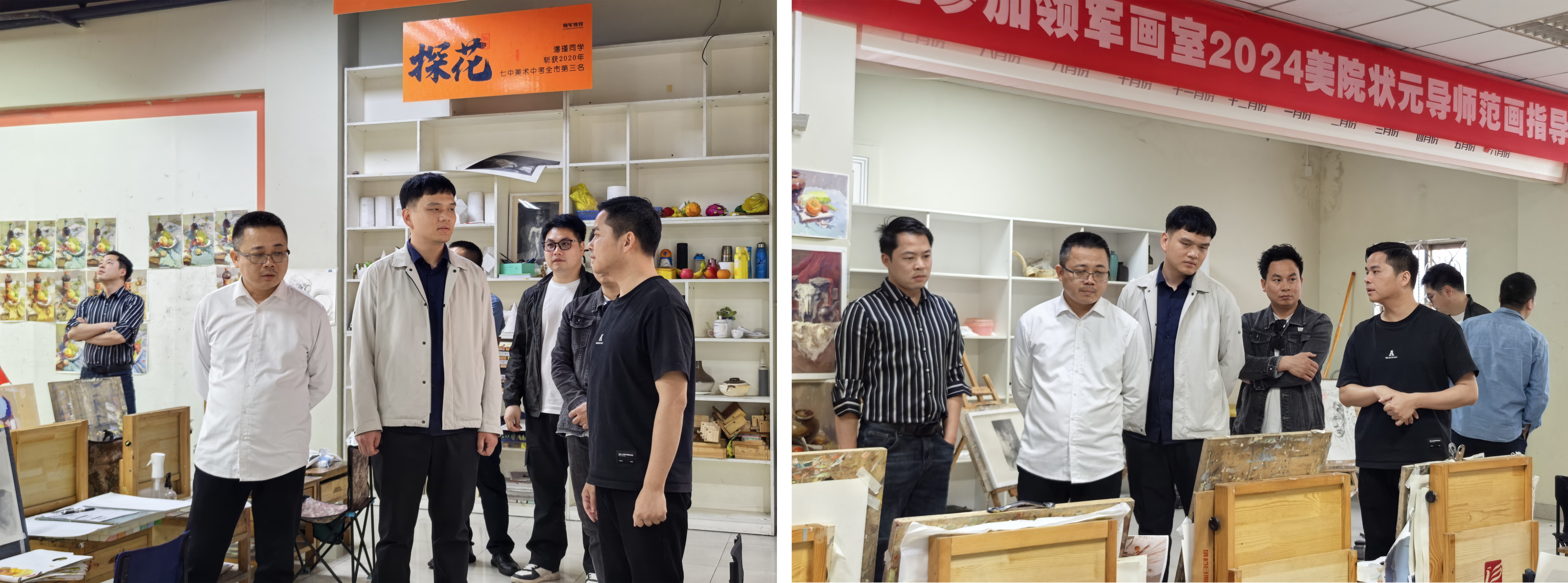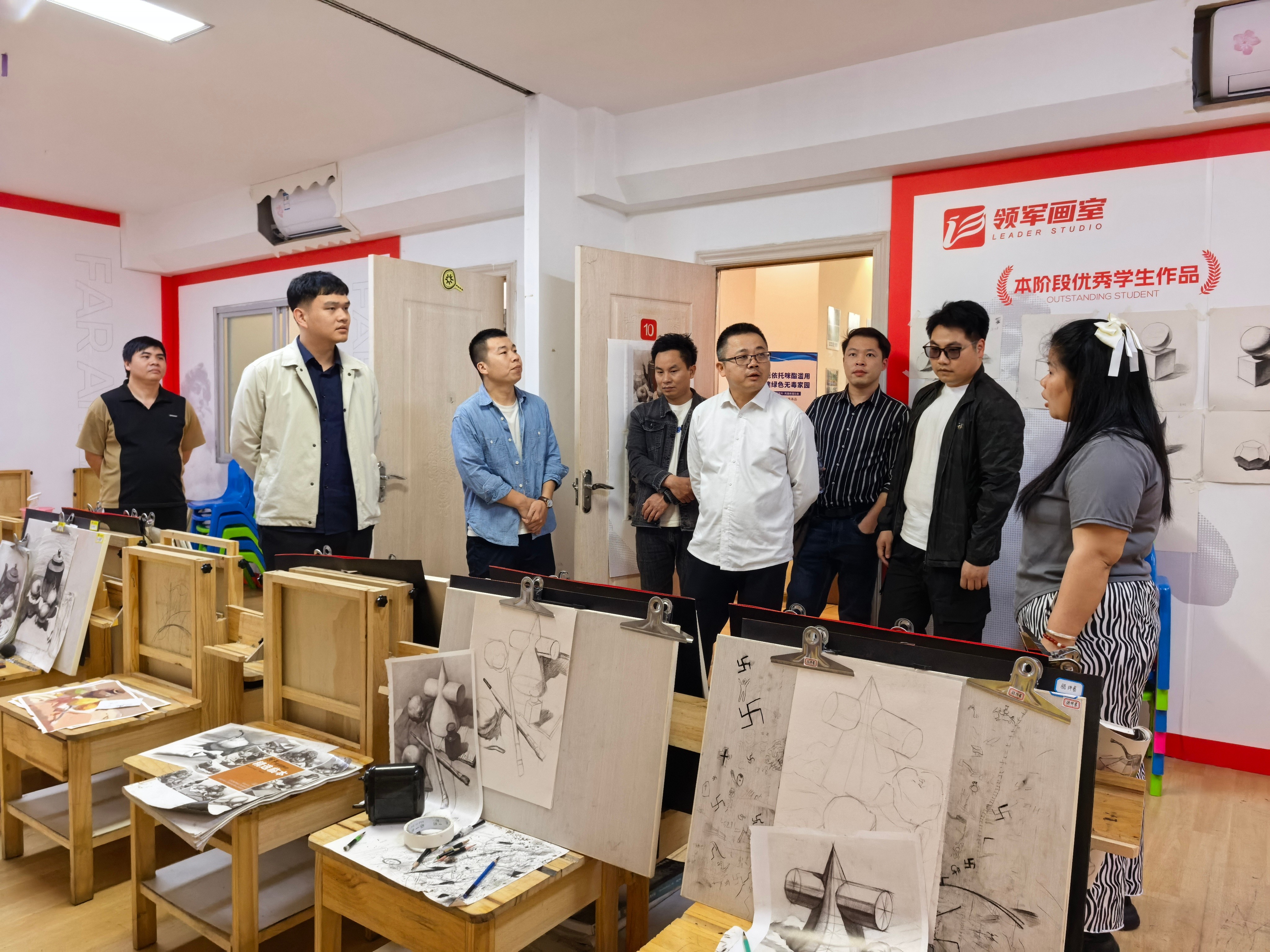 下午1630分,美术学院领导及老师们来到领军画室。此次到访,重点围绕美术学院学生在领军画室的就业情况展开交流。双方就解决学生实习问题进行了深入探讨,明确实习时间安排,以保障实习活动有序开展。同时,美术学院一行人详细了解了领军画室的上课形式和时间安排,以及画室学生数量和考试情况,为学院教学改革和人才培养方案的优化提供了有力依据。