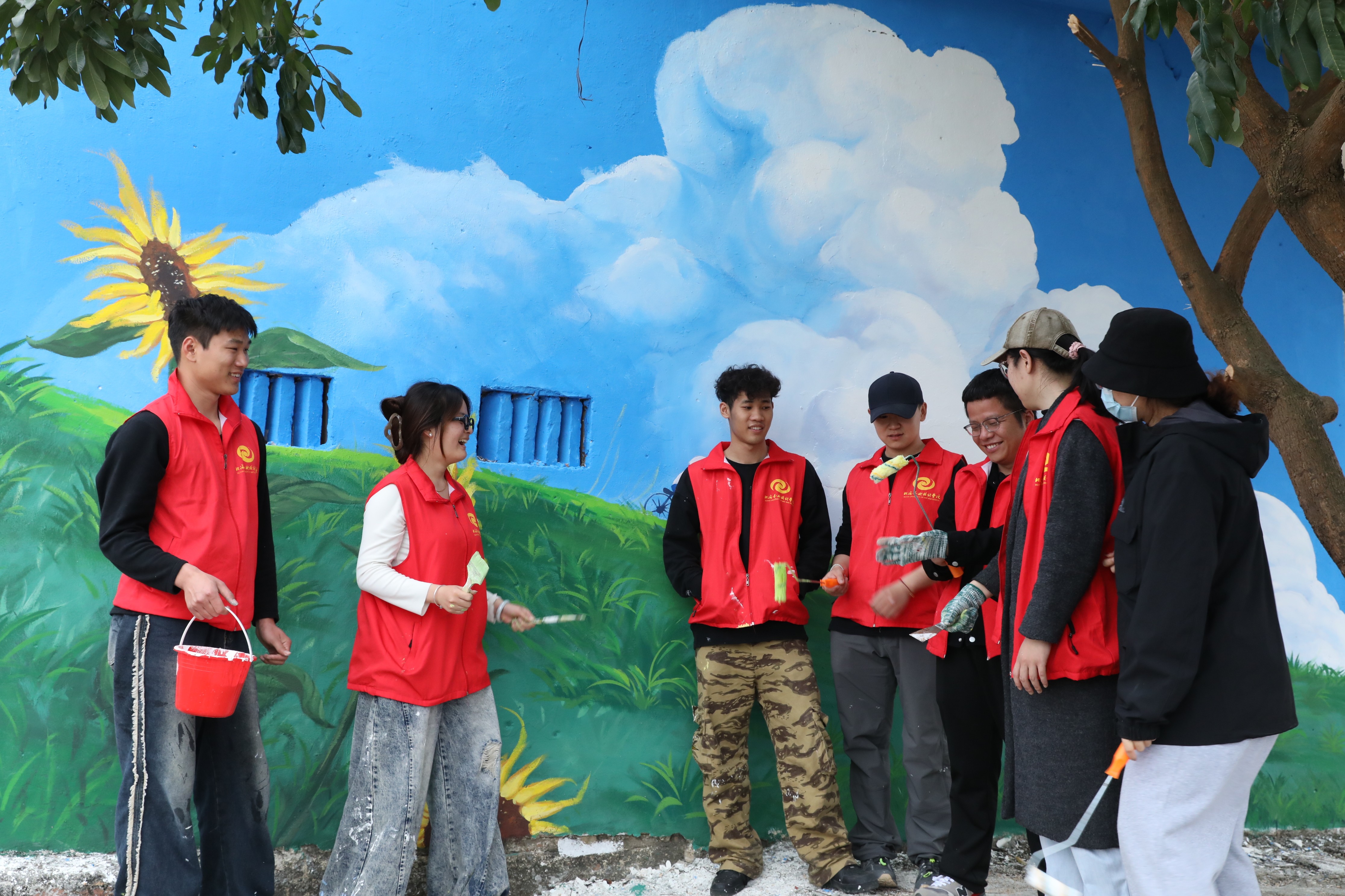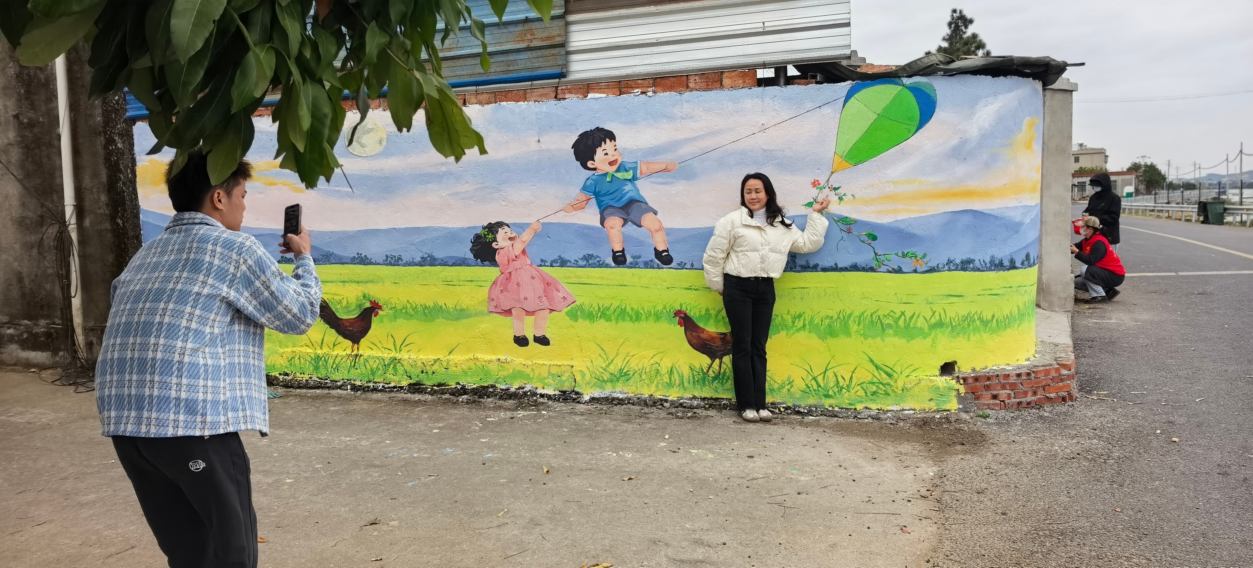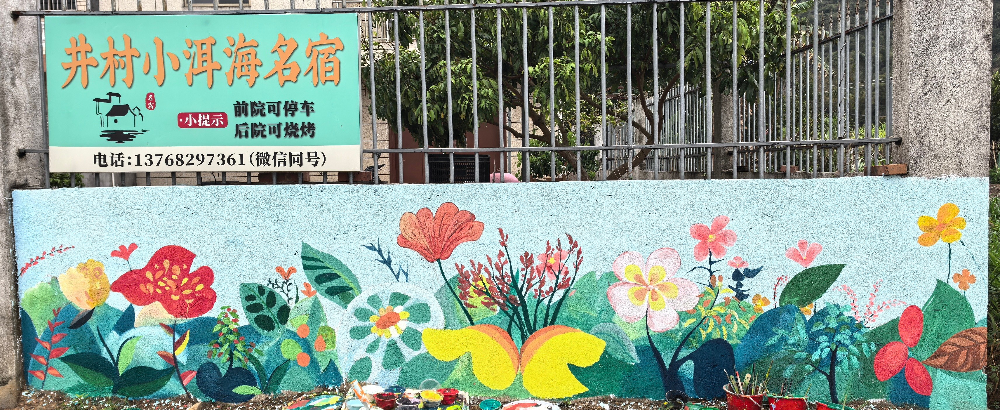 井山村“小洱海”墙绘项目以“红色文化”“农耕文明”“生态旅游”等为主题,30余名师生从调研、设计、实施总计耗时3个月,在五百平方米墙面上创作《红色文化》《渔耕四季》《柿柿如意》等系列作品,将当地特色文化、田园风光转化为可互动的视觉符号,打造“一步一景”的沉浸式乡村文旅体验,验收现场,庞丽副乡长表示:“墙绘不仅扮靓了村容村貌,更让村民在艺术熏陶中增强了文化自信。”
