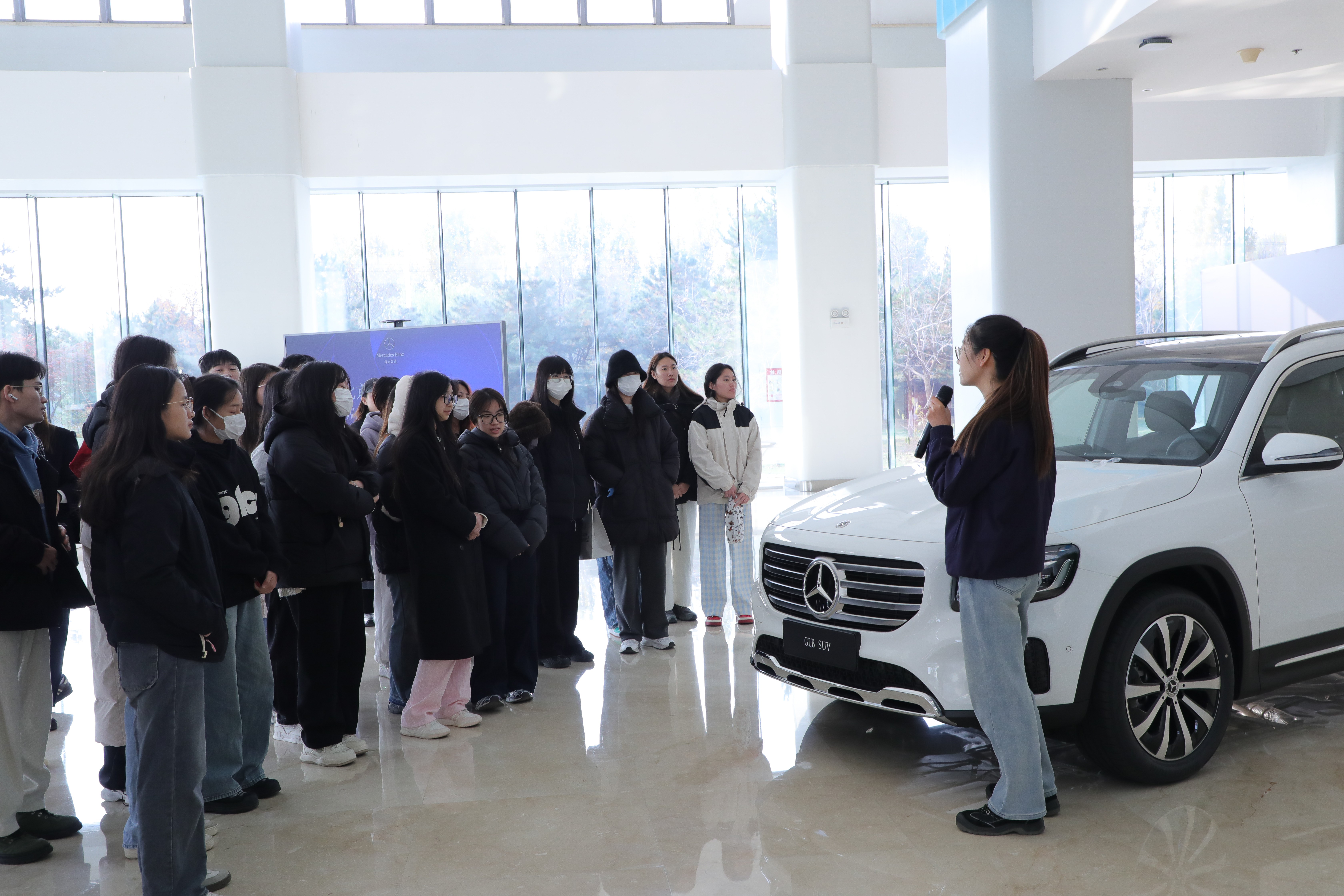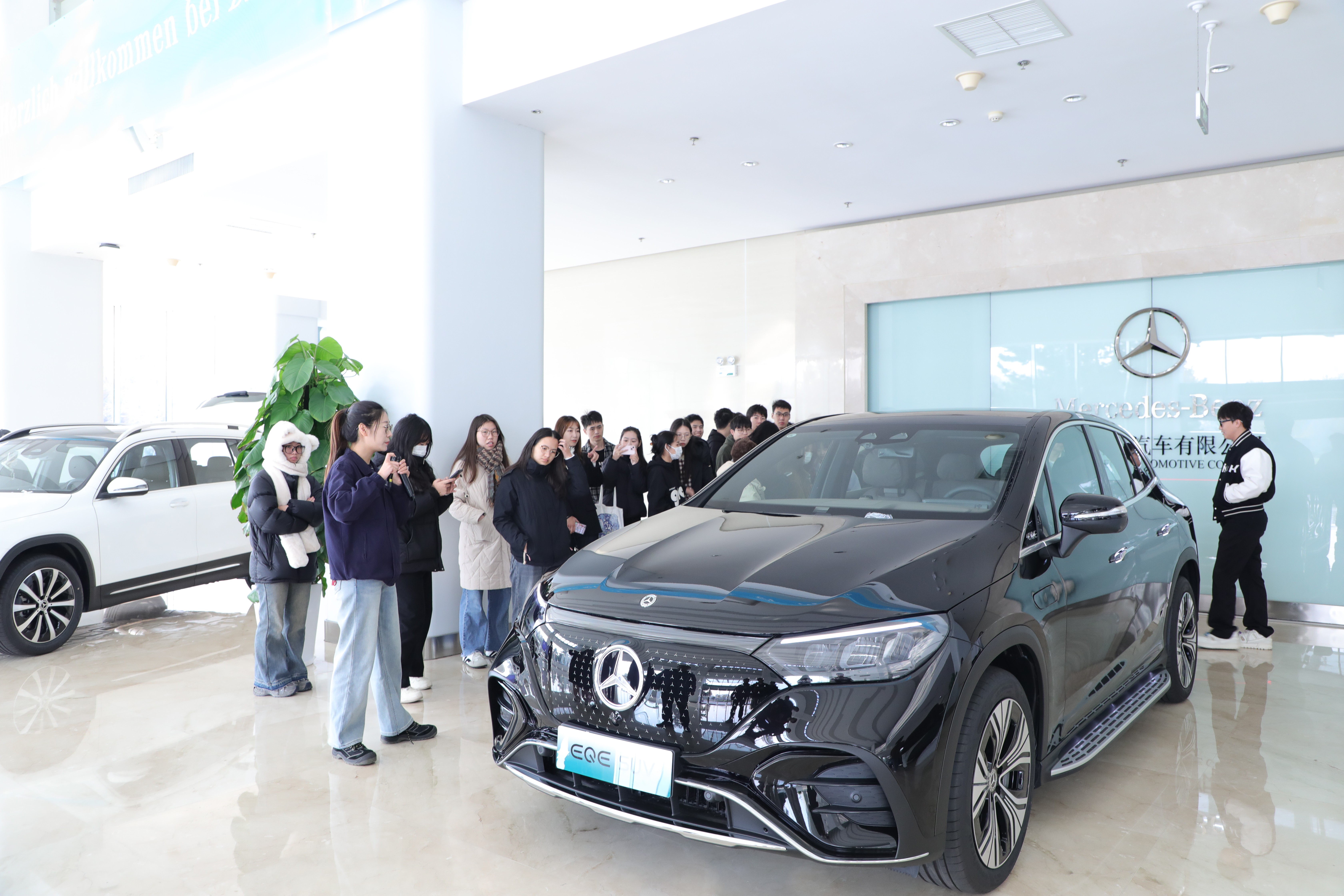 在北京奔驰汽车有限公司,师生们参观了奔驰园区,了解了奔驰公司多年来在汽车设计与技术创新方面的杰出成就。在工作人员的讲解下,学生们深入了解了奔驰的品牌历史、全球布局和在豪华车市场中的领导地位。特别是在三款展车的介绍中,师生们不仅了解到各款车型的性能特点和市场定位,还深刻感受到汽车设计的复杂性与精密性,并领略到了奔驰品牌背后强大的设计哲学和技术积淀。