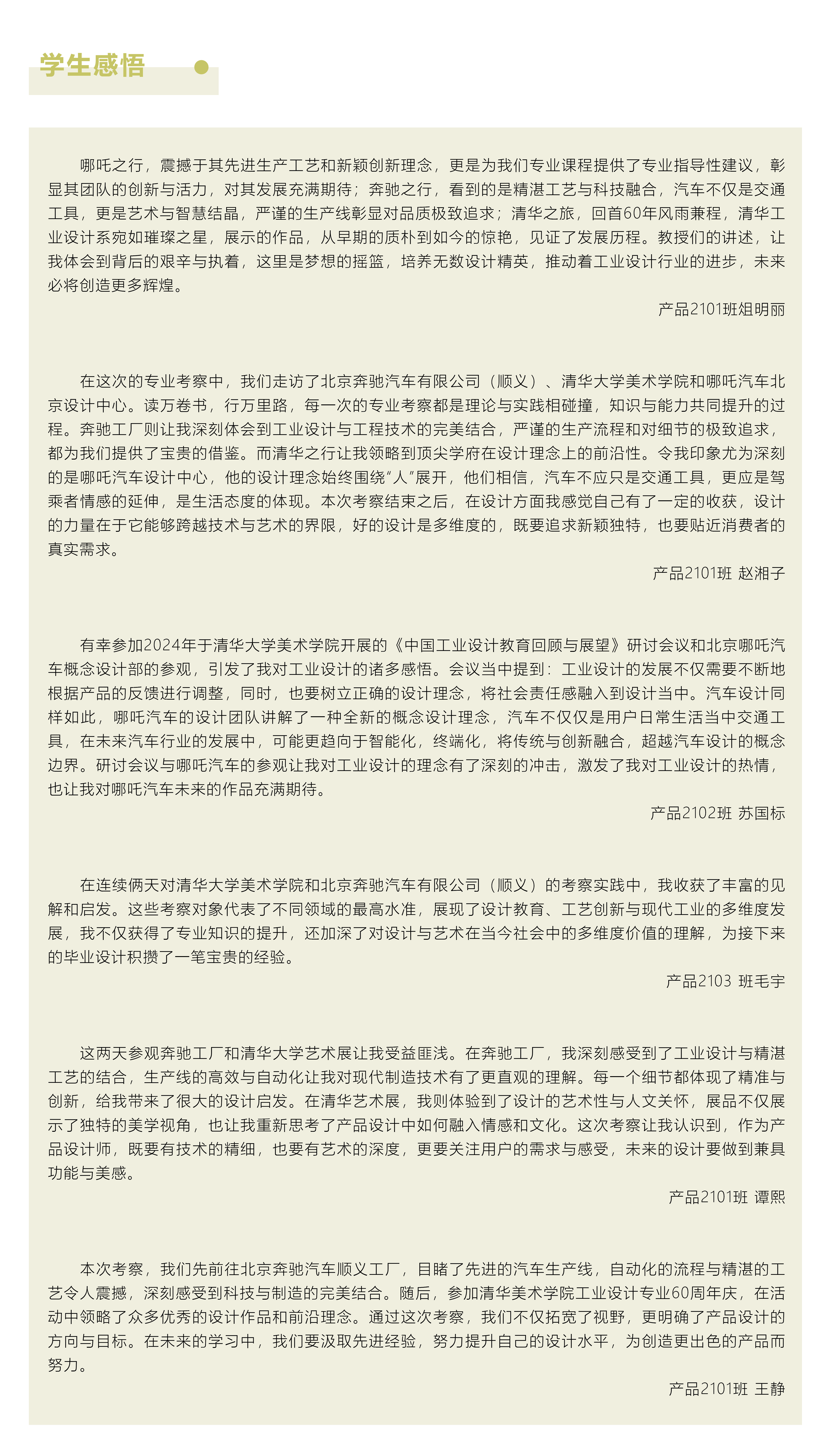 此次在京专业考察活动对于2021级产品设计专业学生而言具有重要意义。通过考察实践和专家交流,学生不仅了解行业发展的前沿动态,还体会到设计对社会、科技与人文的深远影响。学生们的设计视野得到了极大的拓展,创新思维得到了激发。这将为他们未来的学习与职业发展奠定坚实的基础,也为本专业在设计教育领域的改革和创新注入了新的动力。
