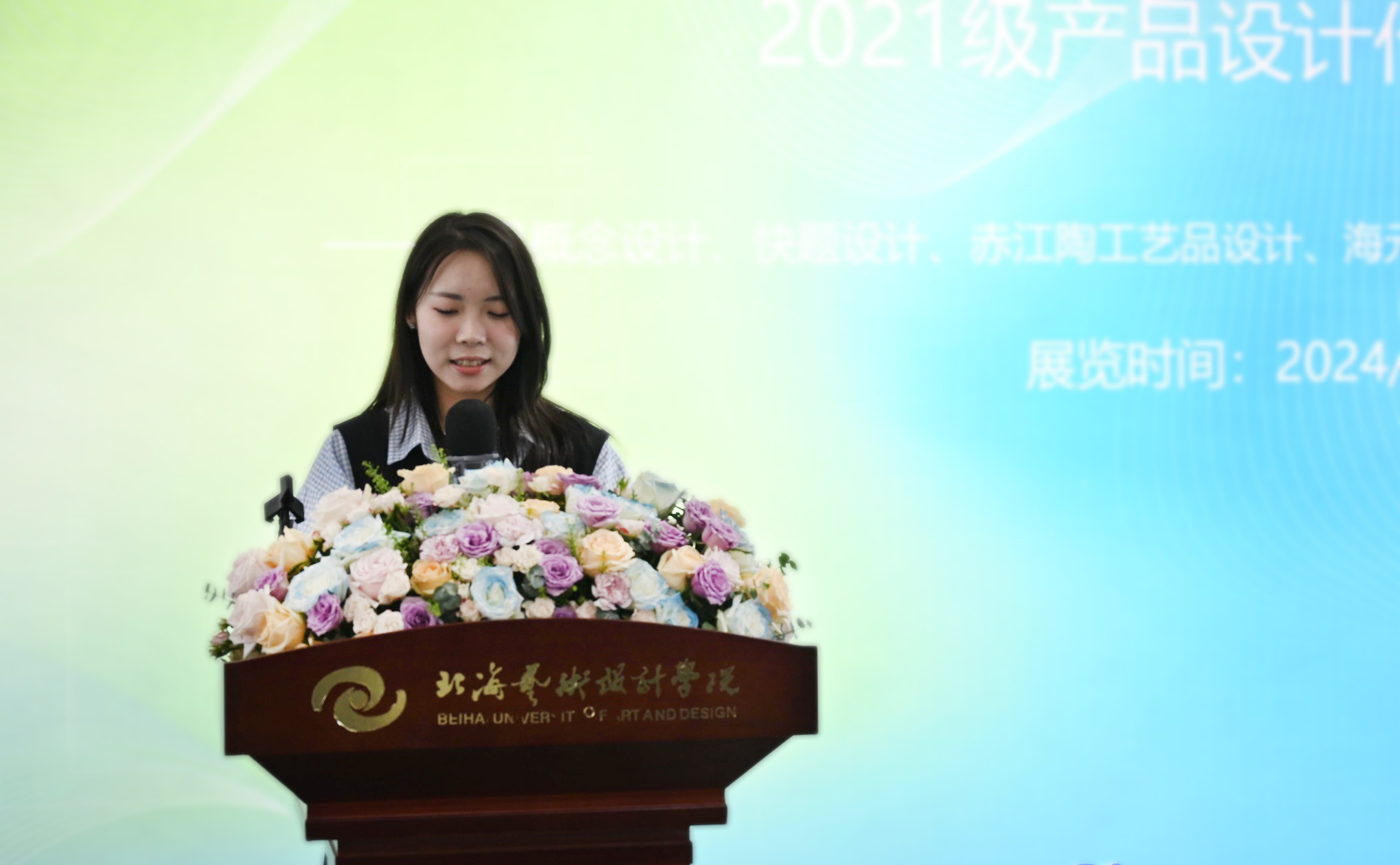 学生代表颜晓敏在发言中感谢学校提供了展示才华与学习交流的平台以及指导老师们的悉心指导与无私付出,并分享了本次课程作业展深刻感受,认为通过不断地丰富设计理论知识,将所学应用于实际设计实践中,拓展设计视野,才能逐渐提高设计水平。她坚信,这样的学习过程和锻炼机会对于每一位产品设计专业的学生来说都是极其宝贵的。