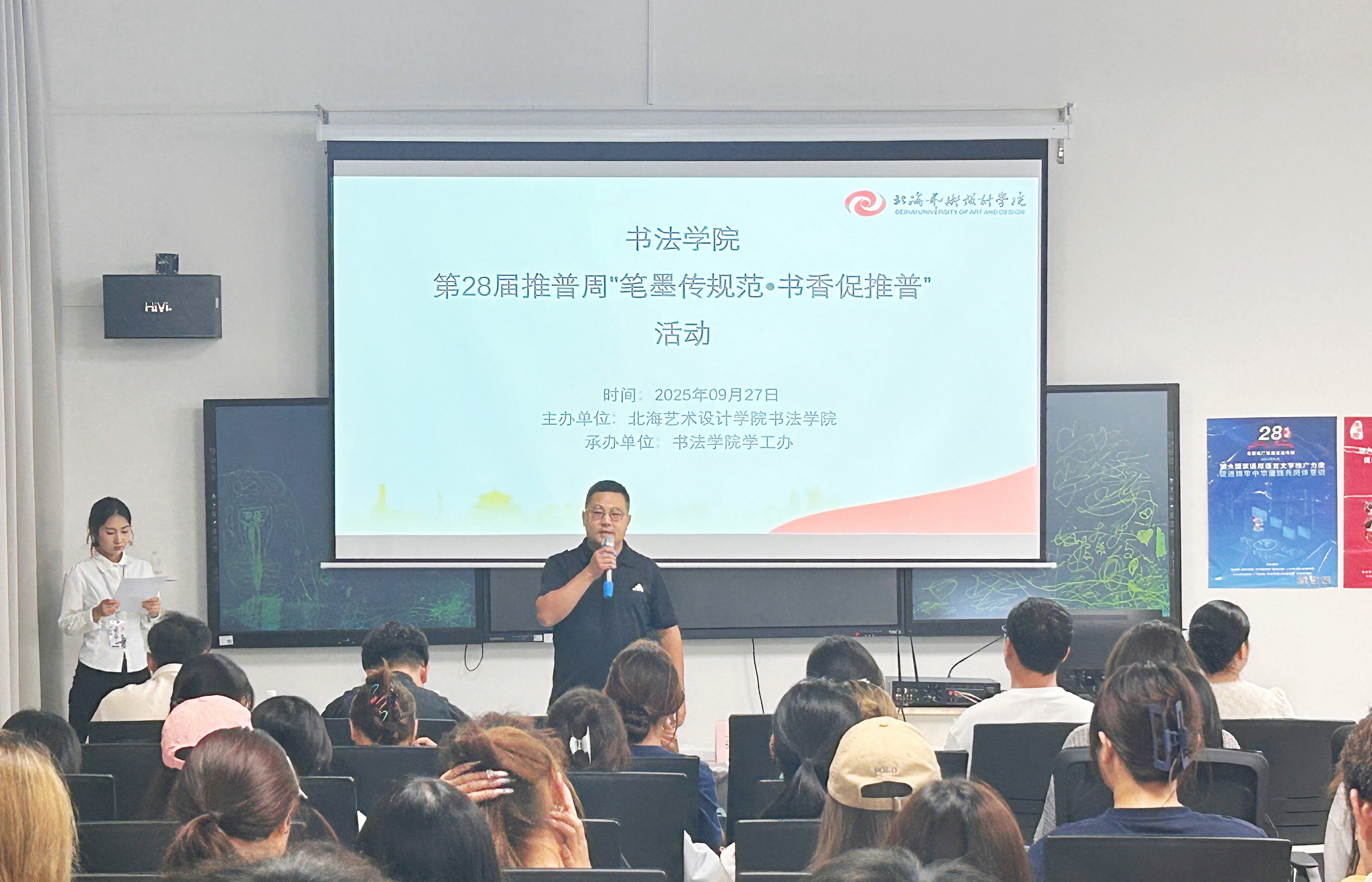 为加大国家通用语言文字推广力度,促进铸牢中华民族共同体意识,书法学院于9月19日至26日组织开展推普活动,并于9月27日在南校区艺德楼507书法教研室举办“笔墨传规范·书香促推普”宿舍规范汉字书写比赛暨推普成果展示活动。学院常务副院长苏乃从、党支部副书记左云飞,以及副院长李东垚、李家琪、黄荣婷、韦志忍共同出席并担任评审。