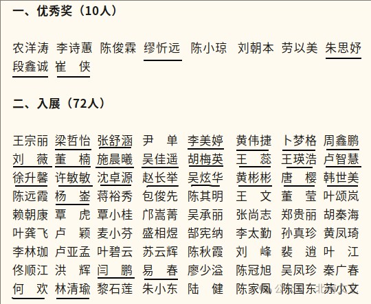 黄伟捷、董楠、闫鹏、易春、梁哲怡、张舒涵、李美婷、卜梦格、周鑫鹏、刘薇、施晨曦、吴佳遥、胡梅英、王蕊、王瑛洁、卢智慧、徐升馨、许敏敏、沈卓源、赵长举、吴炫华、黄彬彬、唐樱、韩世美、杨崟、何欢、林清瑜