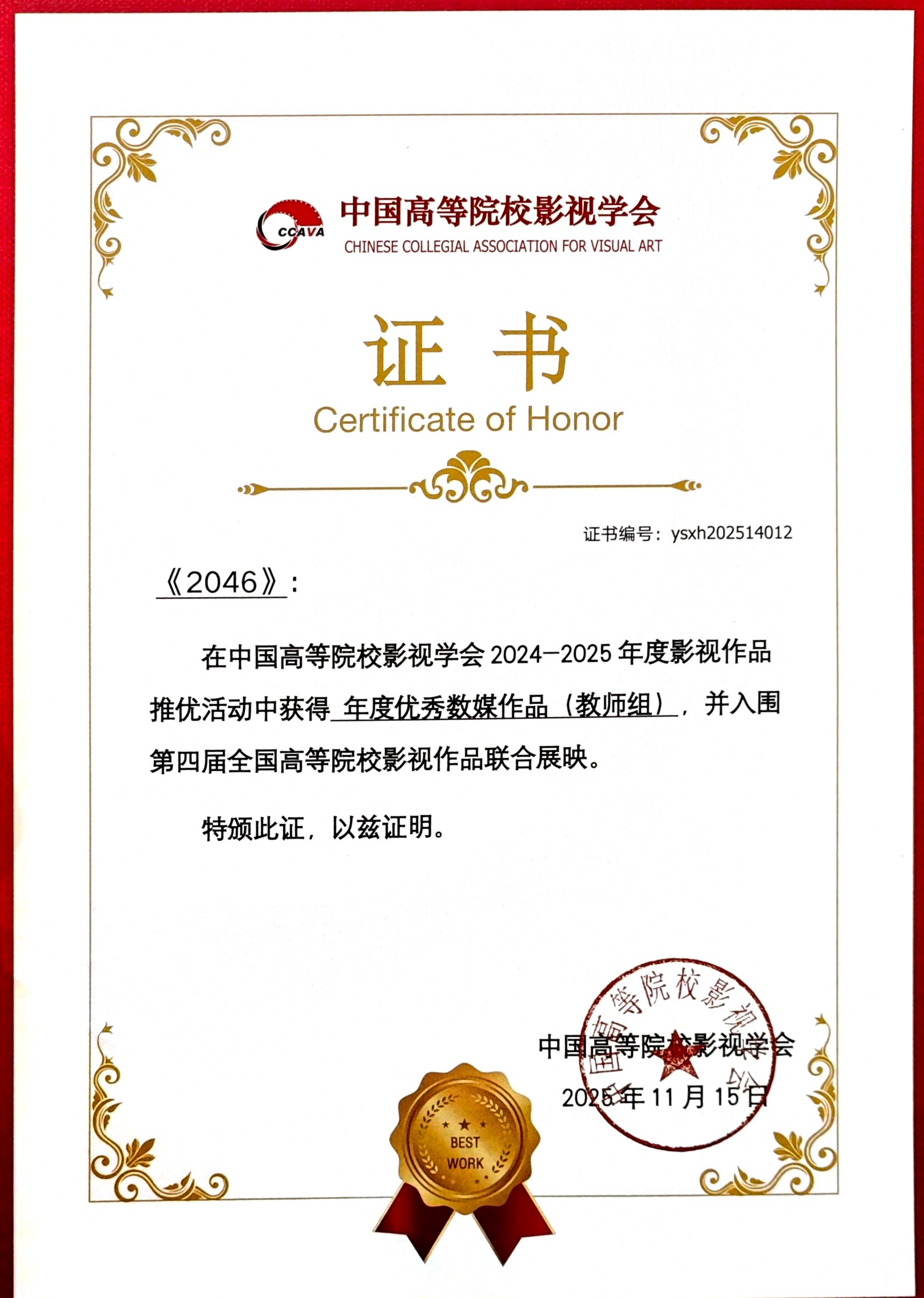 AI作品《2046》证书