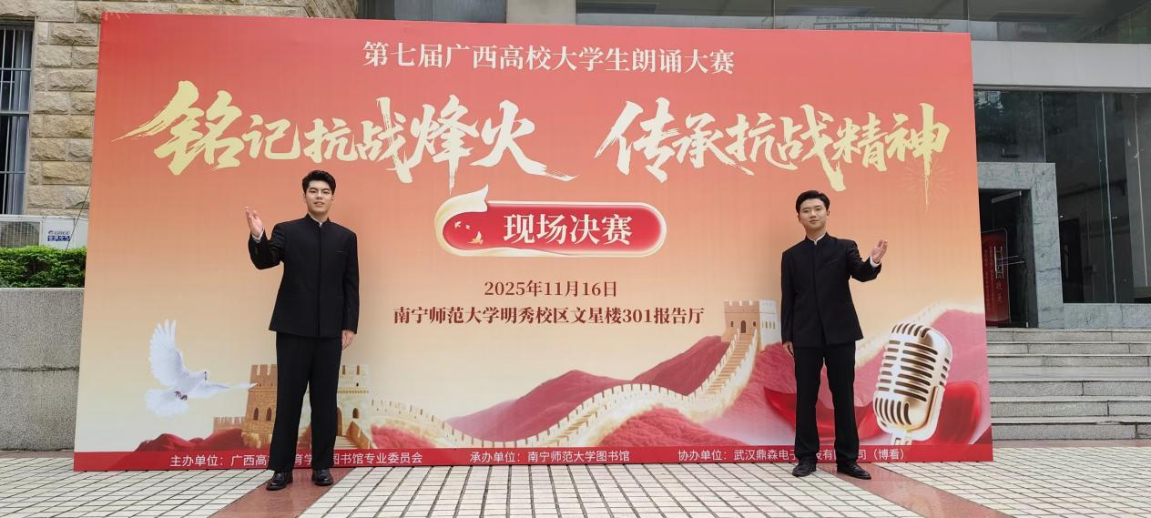 近日,第七届广西高校大学生朗诵大赛现场决赛在南宁师范大学明秀校区文星楼301报告厅圆满落幕。传媒艺术学院2024级播音与主持艺术专业学生李昀泽、冯奎荣携作品《在欢呼的人群中》斩获一等奖,指导老师李超荣获“优秀指导教师奖”,为学校再添荣誉。