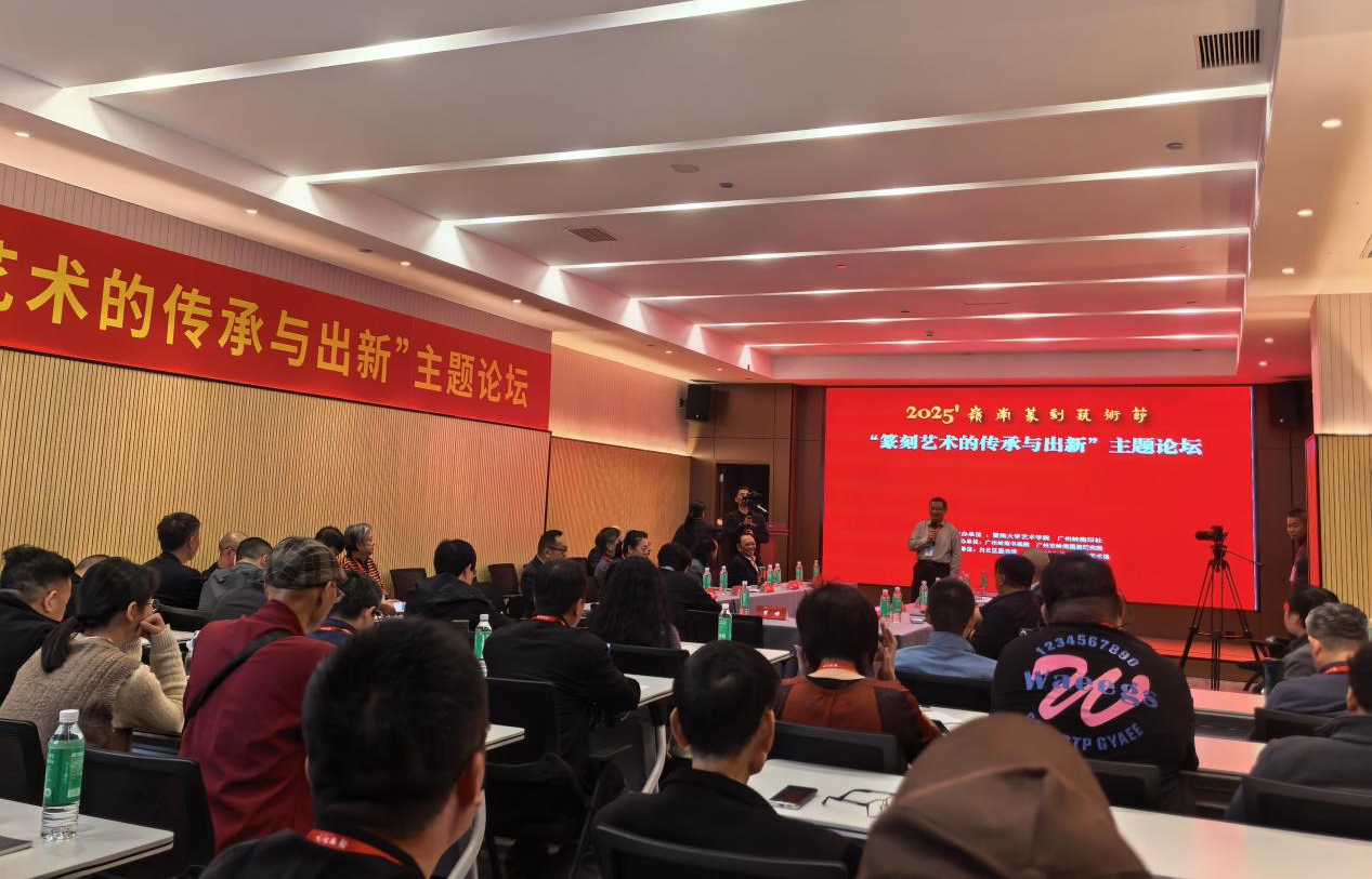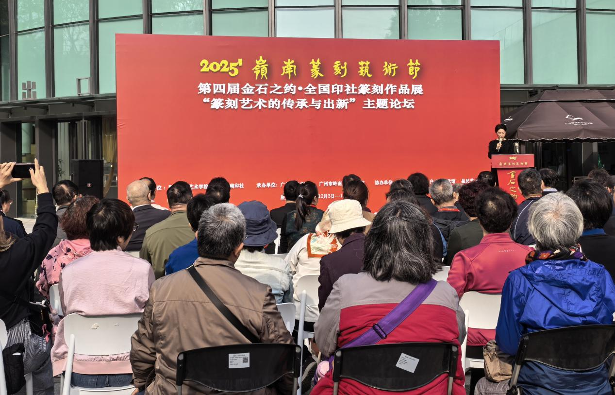 2025年12月3日,“2025岭南篆刻艺术节·第四届金石之约——全国印社篆刻作品展”在广州市白云区图书馆开幕。本次活动由暨南大学艺术学院与广州岭南印社共同主办。我院教师胡慧捷、熊东、李鑫、田梦琴、张天赋及2022级学生韦嘉作品入选本次展览。教师代表熊东受邀出席开幕式及同期举办的“篆刻艺术的传承与出新”学术论坛。