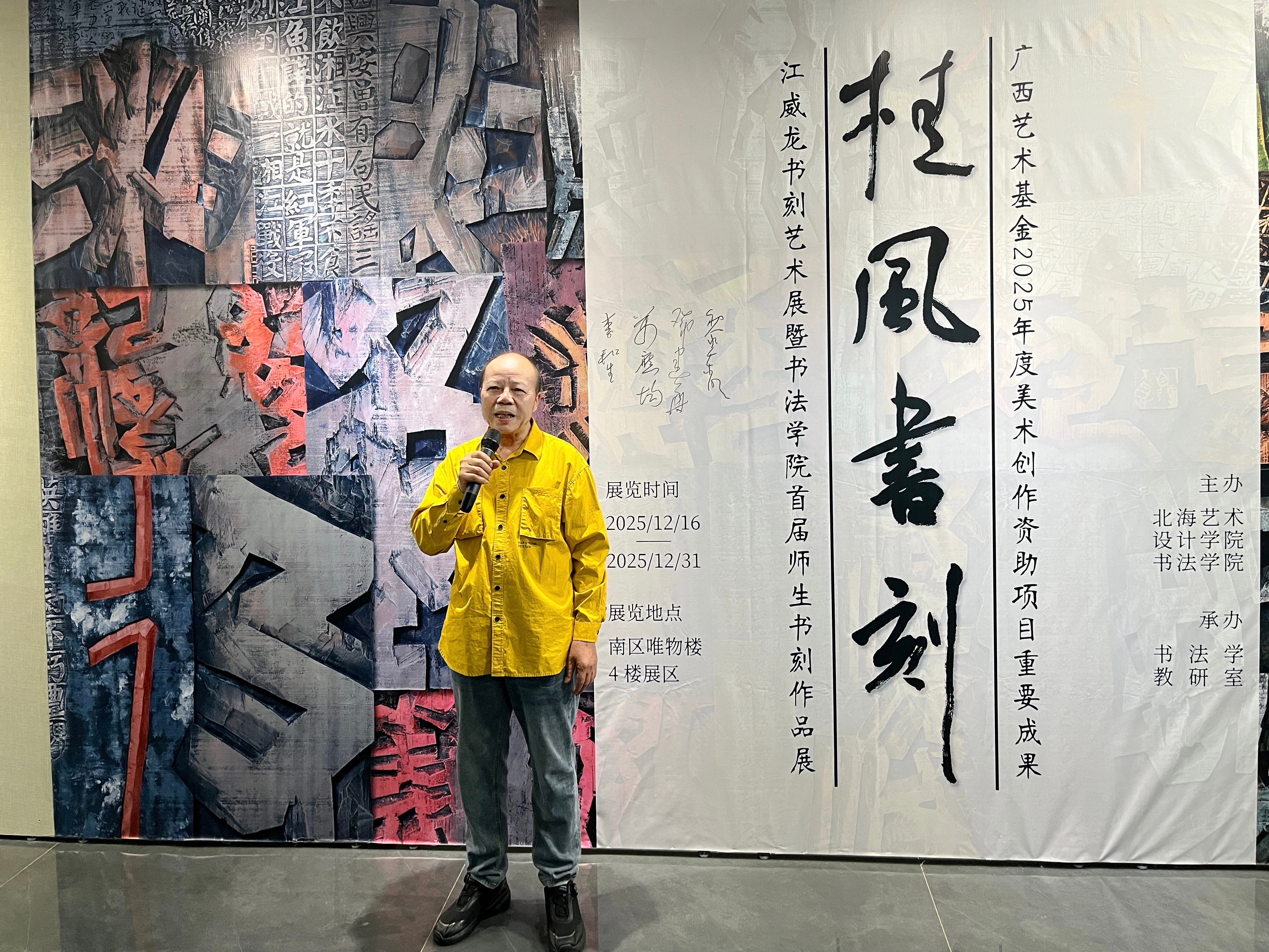 12月19日下午,“桂风书刻——江威龙书刻艺术展暨书法学院首届师生书刻作品展”在北海艺术设计学院唯物楼四楼展区正式拉开帷幕。本次展览作为广西艺术基金2025年度美术创作资助项目的重要成果,由北海艺术设计学院书法学院主办、书法学教研室承办,展期持续至12月31日。