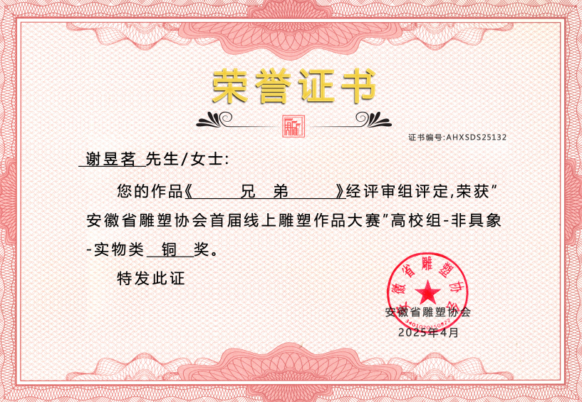 2025 年4 作品《兄弟》获安徽省雕塑协会首届线上雕塑作品大赛高校组-非具象-实物类”铜奖