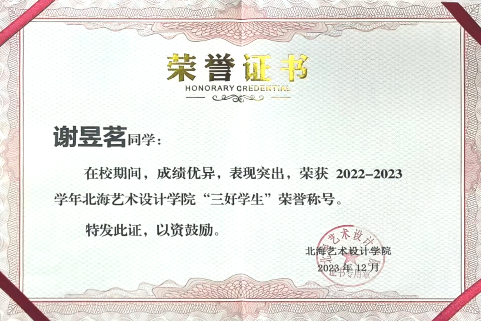 2023年12月 获院级三好学生”称号;