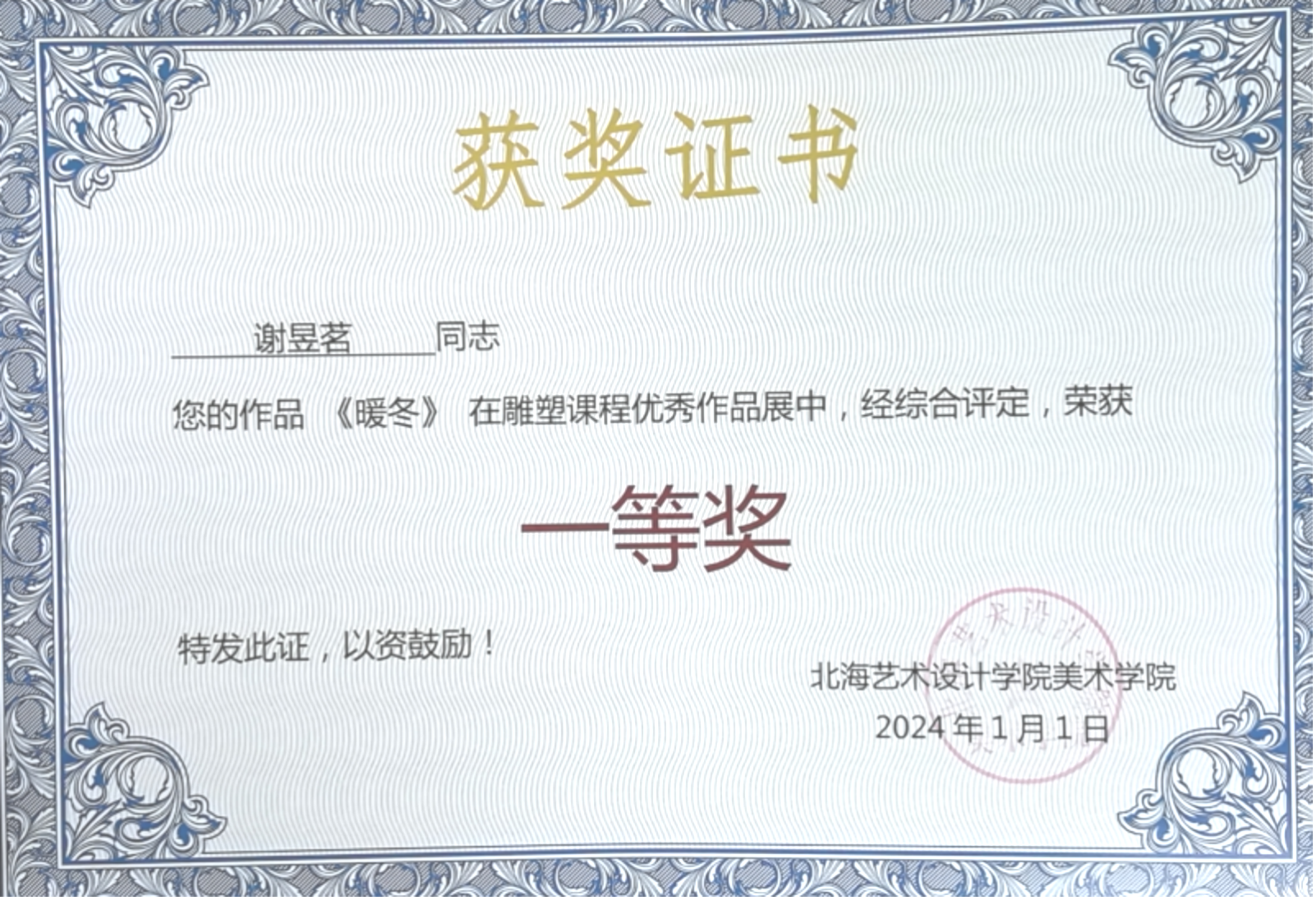 2024年1月 作品《暖冬》在雕塑课程优秀作品展中获院级一等奖