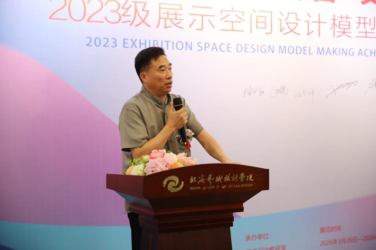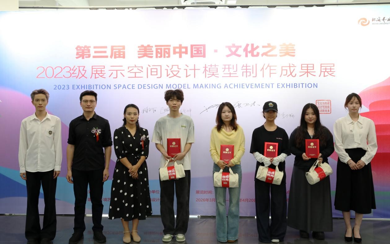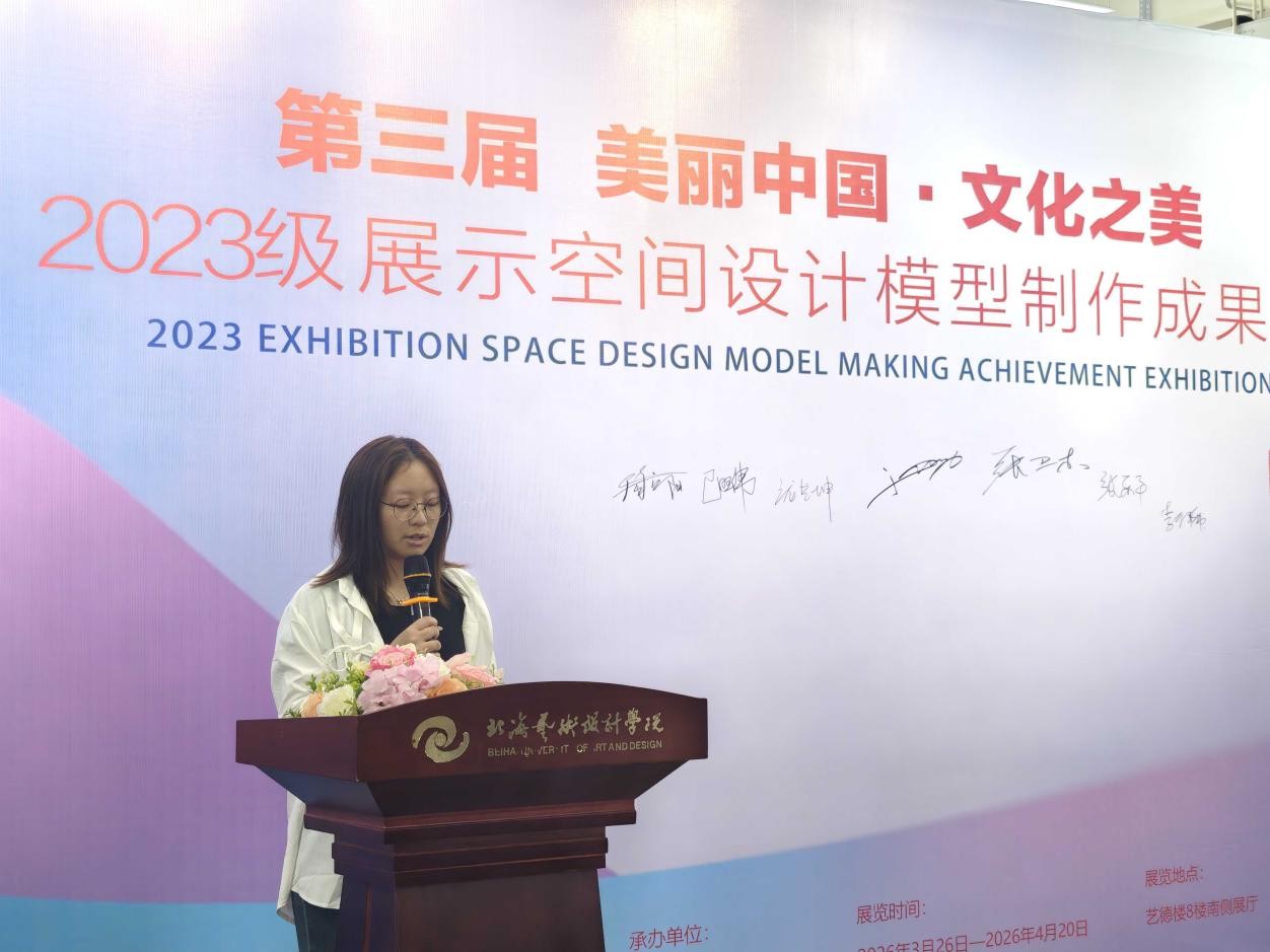 2026年4月3日,金橄榄设计大赛第三届“美丽中国·文化之美”2023级展示空间设计模型制作成果展在北海艺术设计学院南校区艺德楼八楼展厅举行。本次展览由建筑与环境艺术学院主办,学院环境设计教研室承办,建筑与环境艺术学院党总支、学工办、综合办、分团委联合协办,为师生搭建了展示专业成果、交流设计理念的重要平台。