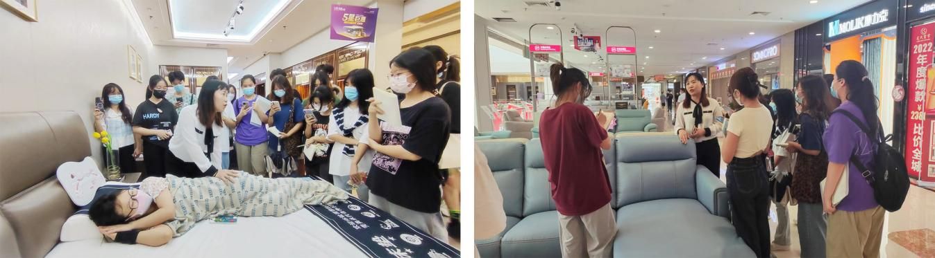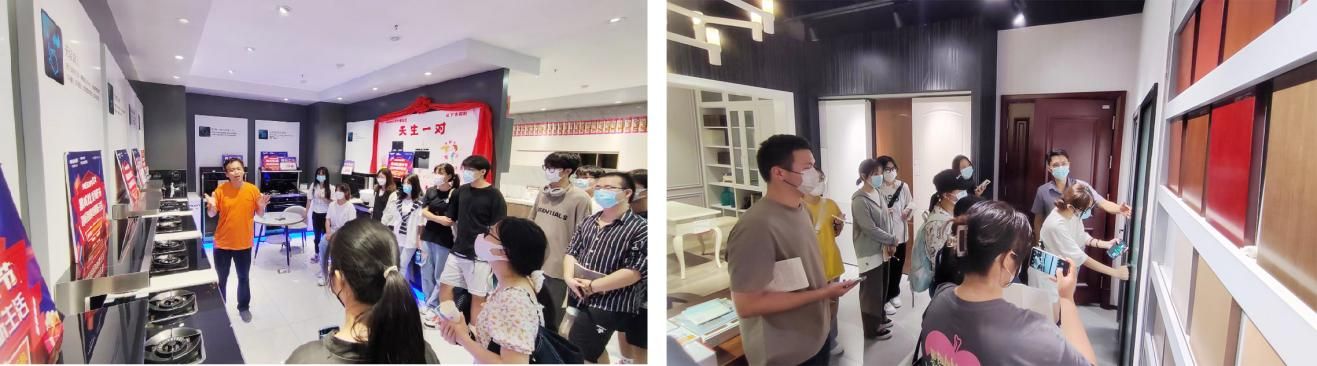 目光跟随第一批学生而至,踏入门店,其各式品质材料、高新技术、装饰搭配应接不暇。此次实地调研考察课程,将学生放归材料间隙之中,通过“专业老师分析+门店管理讲解”的方式,实地自主探究学习,深化记忆。